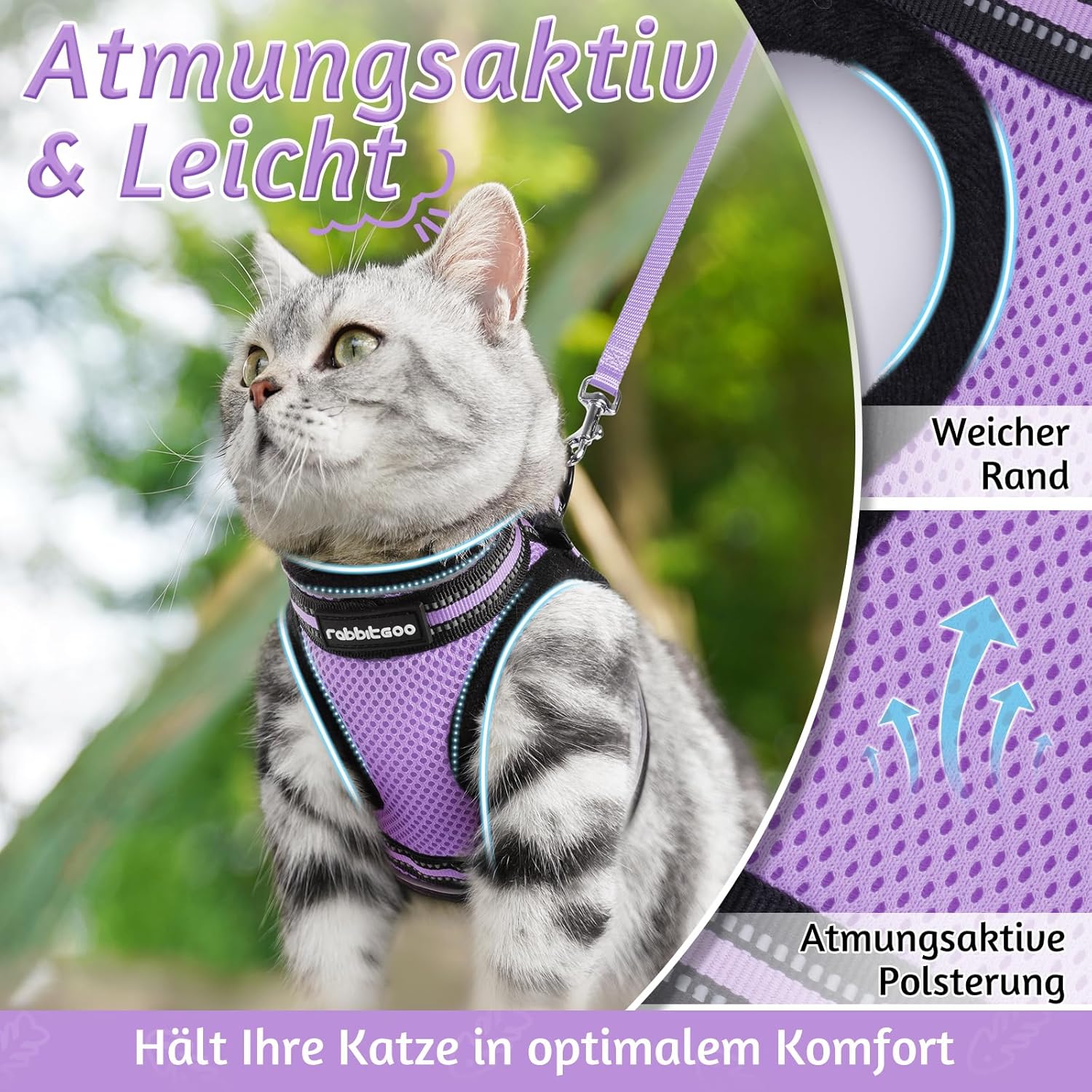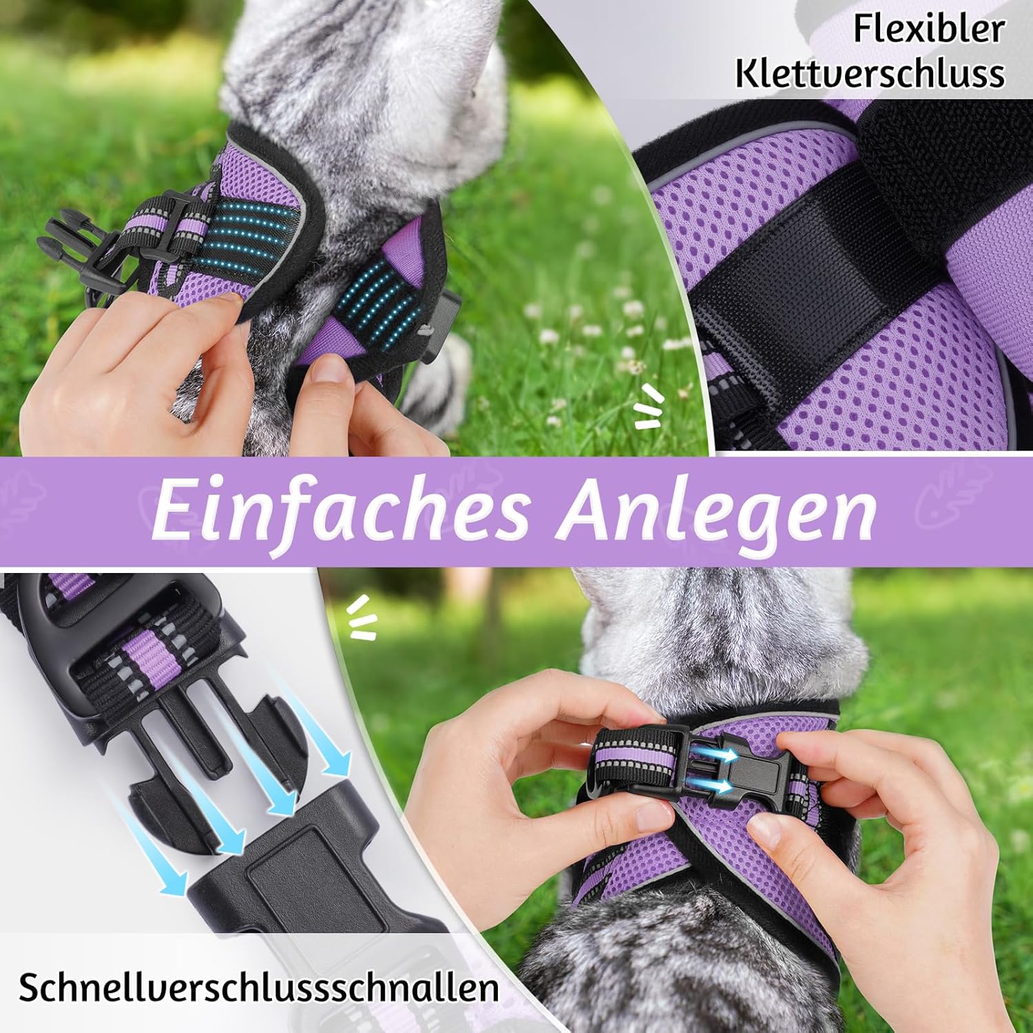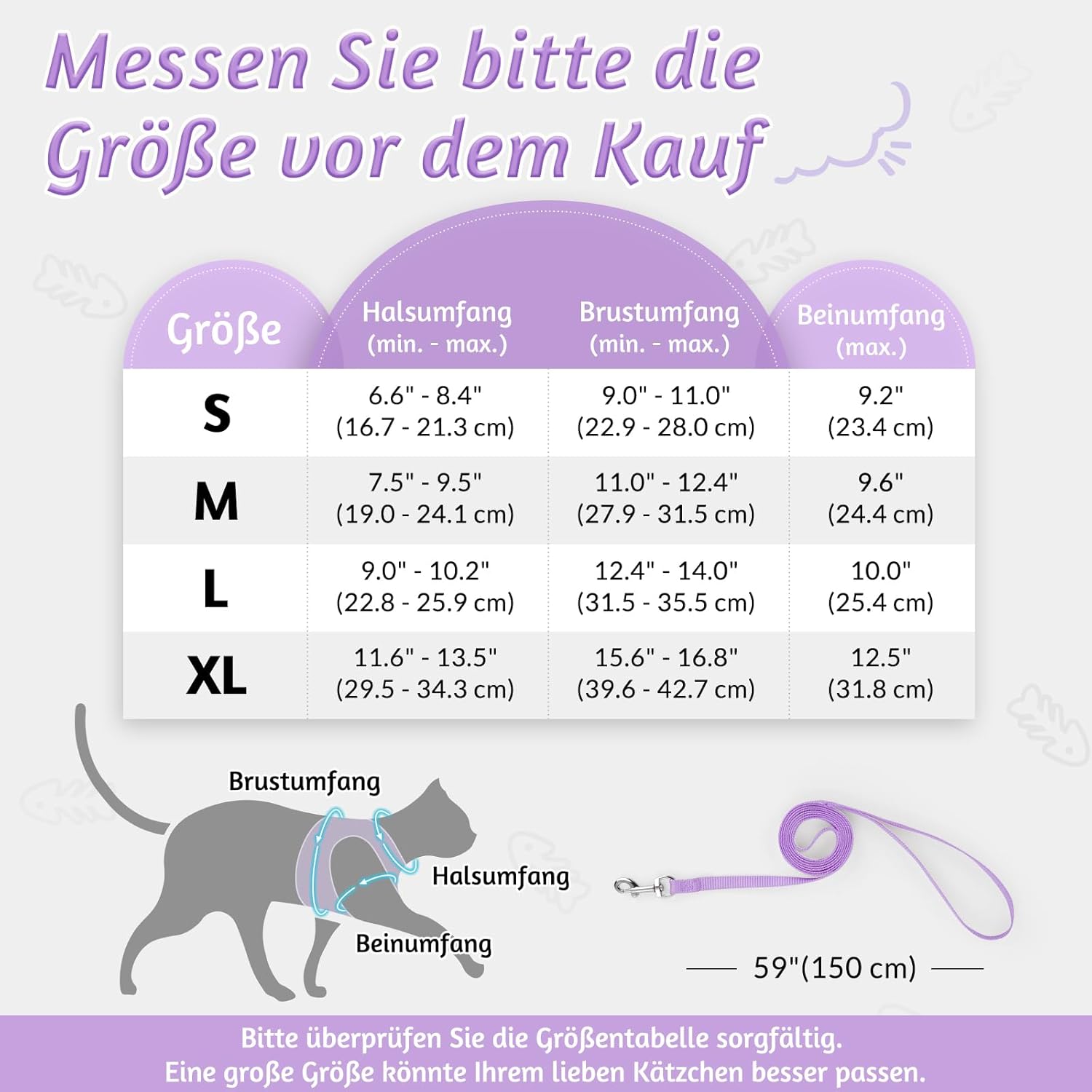 ПАСВА ПЕРФЕКТНО ЗА ВРАТА 17-21 СМ ГЪРДЕН КРЪГ 23-28 СМ Моля, измерете точно котката си и внимателно изберете нагръдник според таблицата с размери. За по-добро прилягане на вашето очарователно котенце се препоръчва да изберете по-голям размер. Комплектът включва: 1 x нагръдник за котки и 1 x найлонова каишка (149,9 см). Създаден за комфорт и функционалност, дизайнът на жилетката прави този нагръдник лесен за поставяне и сваляне. А регулируемата каишка създава перфектно прилягане за вашата котка с известно пространство за растеж. (Съвети: моля, дайте на котката си известно време да се запознае с този нагръдник за първи път)