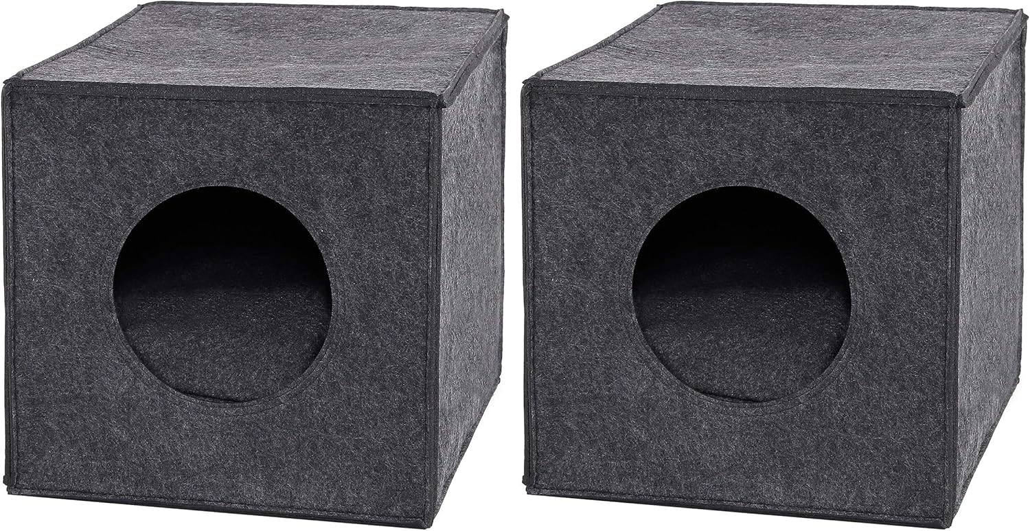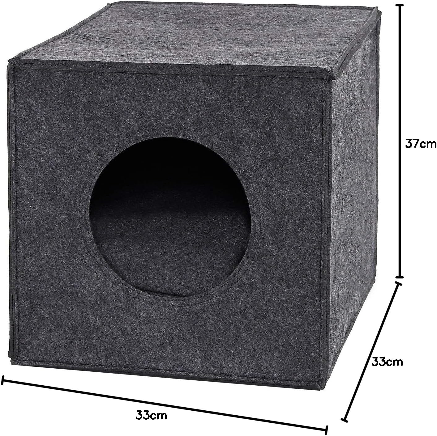 Кубообразната пухкава пещера, изработена от здрав филц, има вход с диаметър 17 см и дебелина на стената 5 мм, размерите са 33 x 37 x 33 см. Филцовата пещера е подходяща за стандартни рафтове, като например рафтовете Ikea Kallax или Ikea Expedit. Също така е свободностояща и предлага уютно място за спане. Предлагаме тази филцова куба в цветовете светло сиво и тъмно сиво, с или без мека възглавница, чийто калъф може да се сваля за почистване.