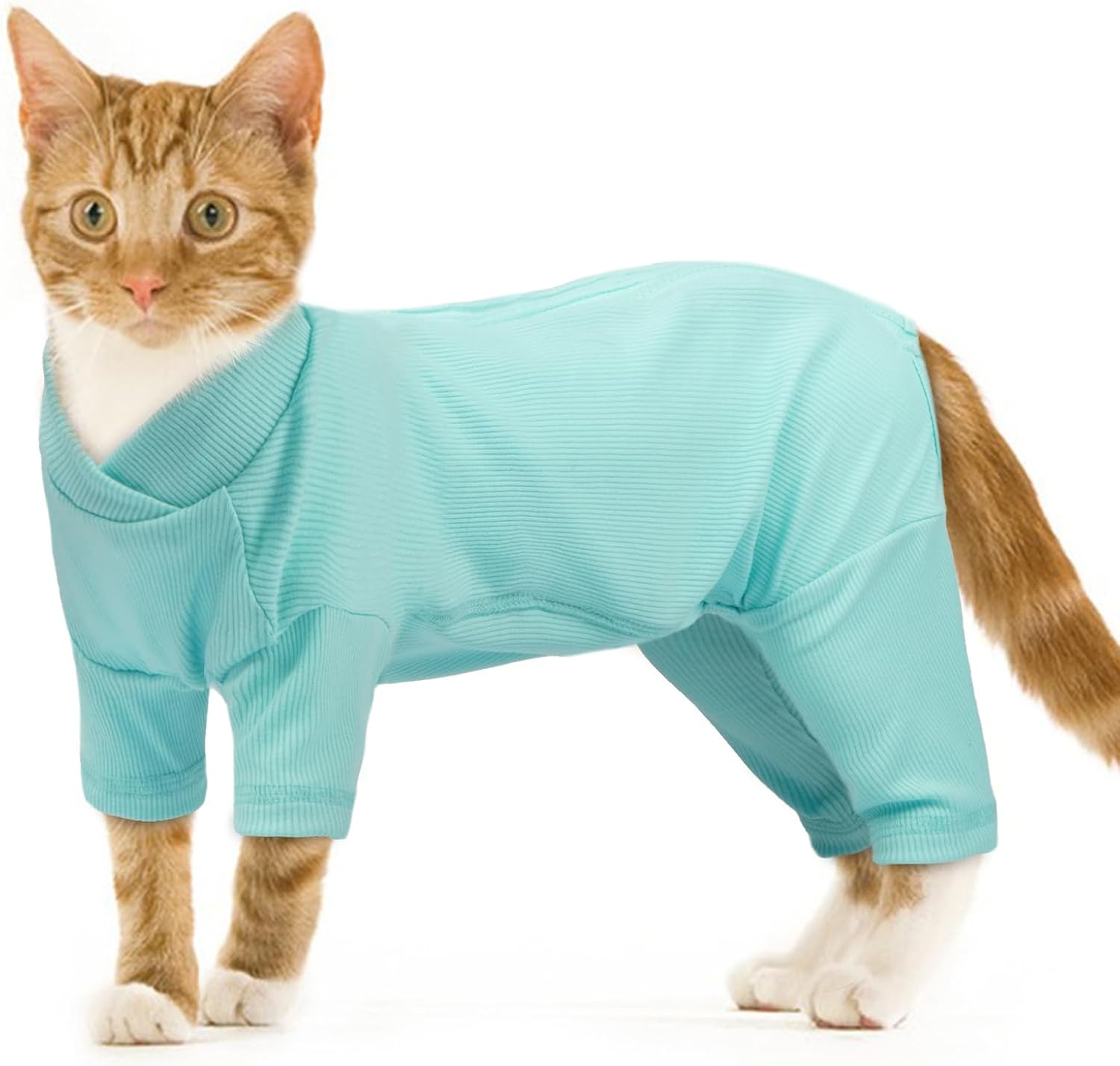 • Напълно защитен дизайн Четирикракият дизайн на котешкия гащеризон осигурява цялостна защита, а коремната част на котешката дреха е отворена за лесно прекарване на тоалетна. Той ефективно намалява косопада и държи котешката козина далеч от мебелите. Покрива рани, за да предотврати облизването им (Забележка: голям отвор на корема, не е подходящ като котешки гащеризон след кастрация или за покриване на коремни рани).