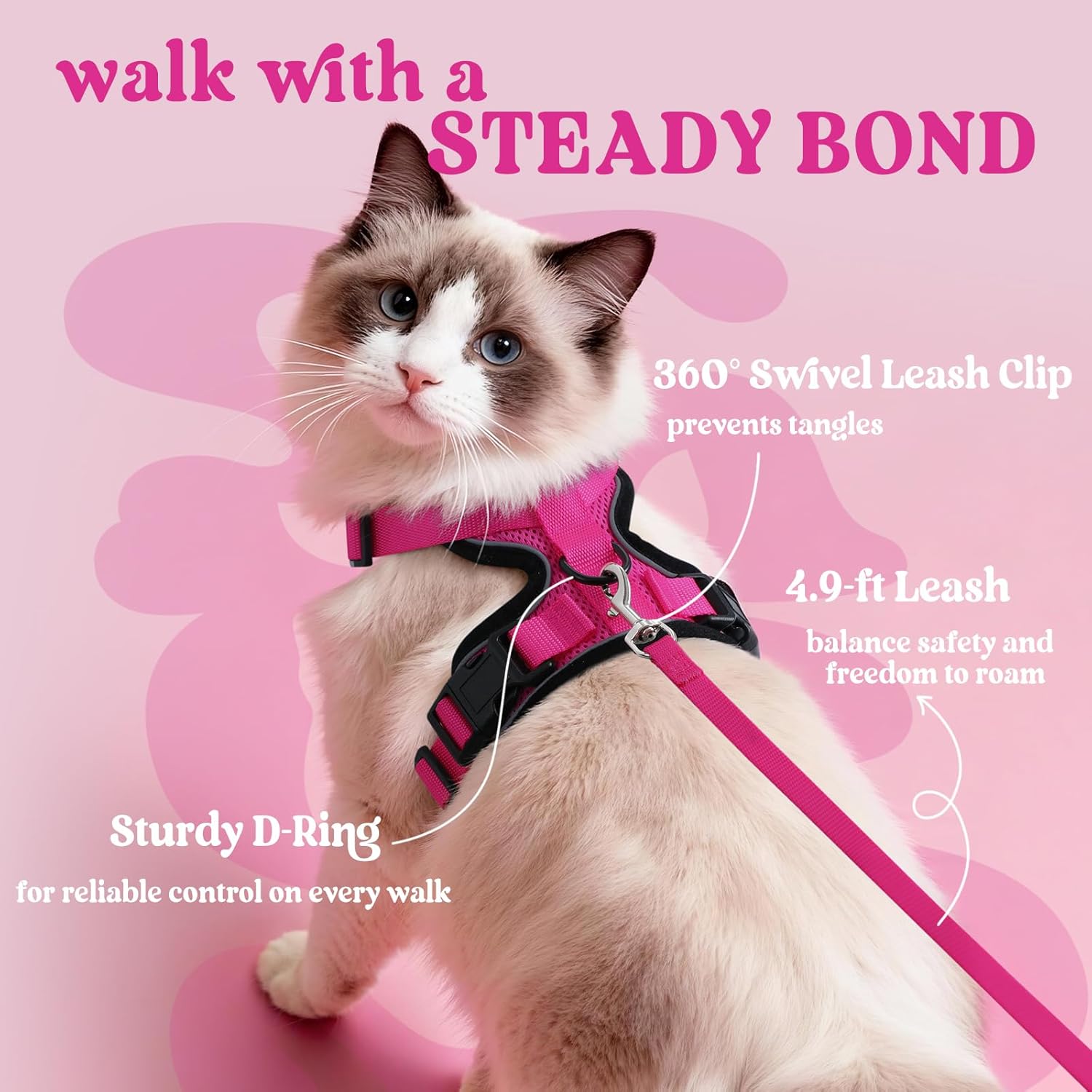 • По-добър контрол против дърпане: Прикрепете котешката каишка към металната щипка за каишка на гърба ѝ с дългата, издръжлива найлонова каишка, за да може котката ви да изследва природата безопасно и удобно. Дизайнът на котешката жилетка разпределя налягането на каишката равномерно по гърдите и рамото, за да предотврати задавяне или напрежение във врата, което осигурява много по-голям комфорт и безопасност.