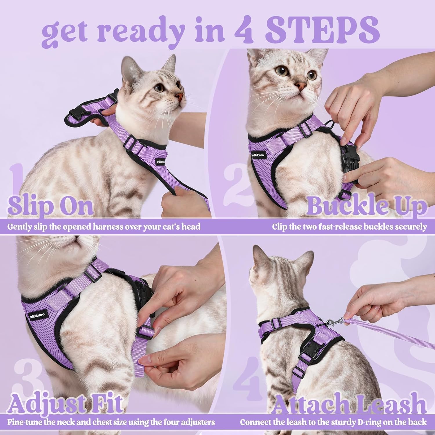 Котешки нагръдник rabbitgoo с каишка, мек нагръдник за котки, нагръдник, котешки нагръдник, защитен от бягство, регулируем котешки жилет, светло лилав, M