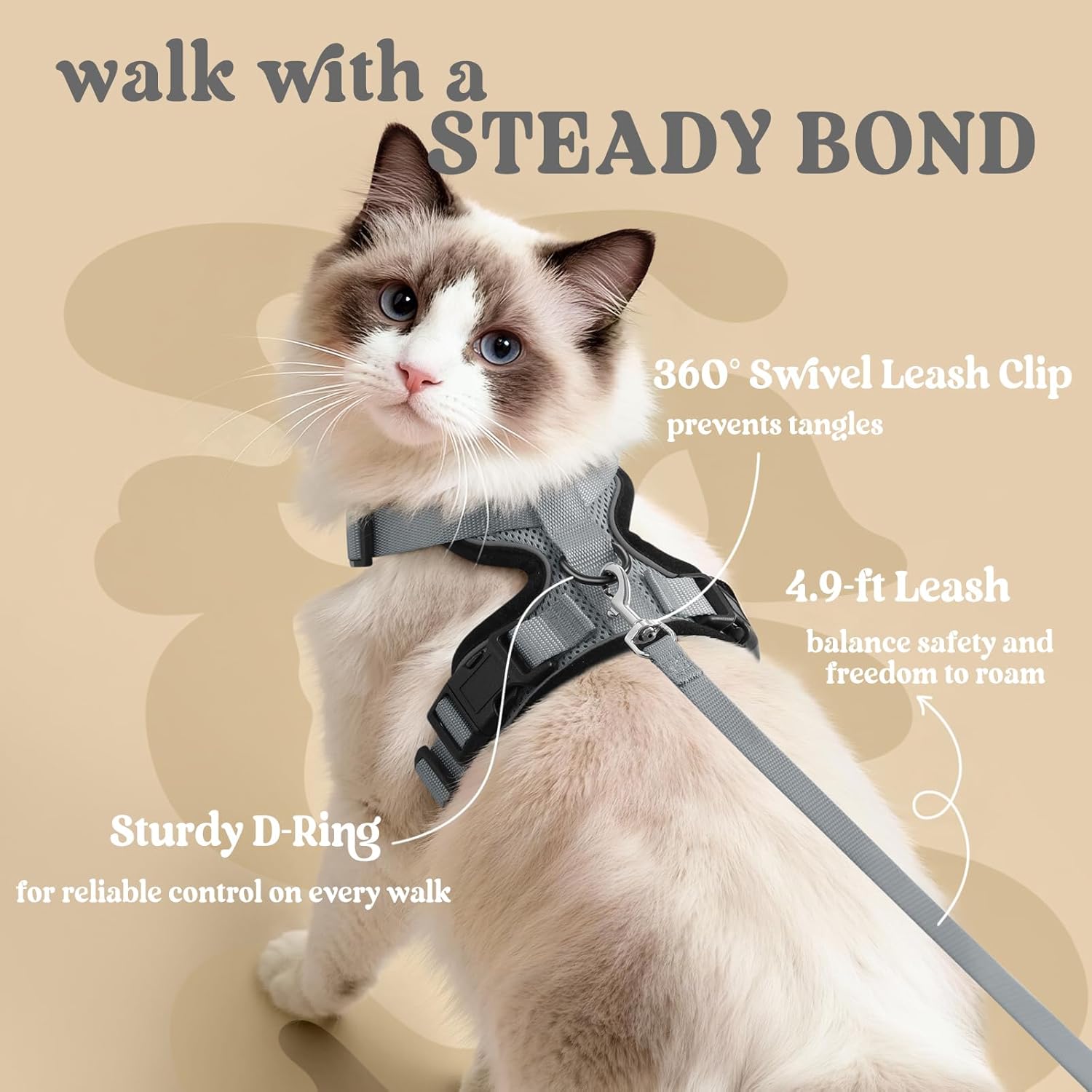 • По-добър контрол против дърпане: Прикрепете котешката каишка към металната щипка за каишка на гърба ѝ с дългата, издръжлива найлонова каишка, за да може котката ви да изследва природата безопасно и удобно. Дизайнът на котешката жилетка разпределя налягането на каишката равномерно по гърдите и рамото, за да предотврати задавяне или напрежение във врата, което осигурява много по-голям комфорт и безопасност.
