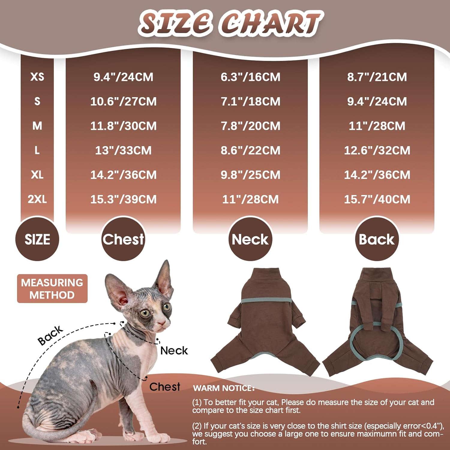 • Пуловер за котка сфинкс: Внимание: всички тези предложения за размери са само за безкосмести котки. Предлага се в шест размера от XS до XXL, така че всеки любител на котки ще намери перфектното прилягане. Нашите дрехи са специално проектирани за специалните нужди на безкосместите котки и гарантират както комфорт, така и модерен външен вид. Осигурете на любимия си домашен любимец перфектното прилягане.