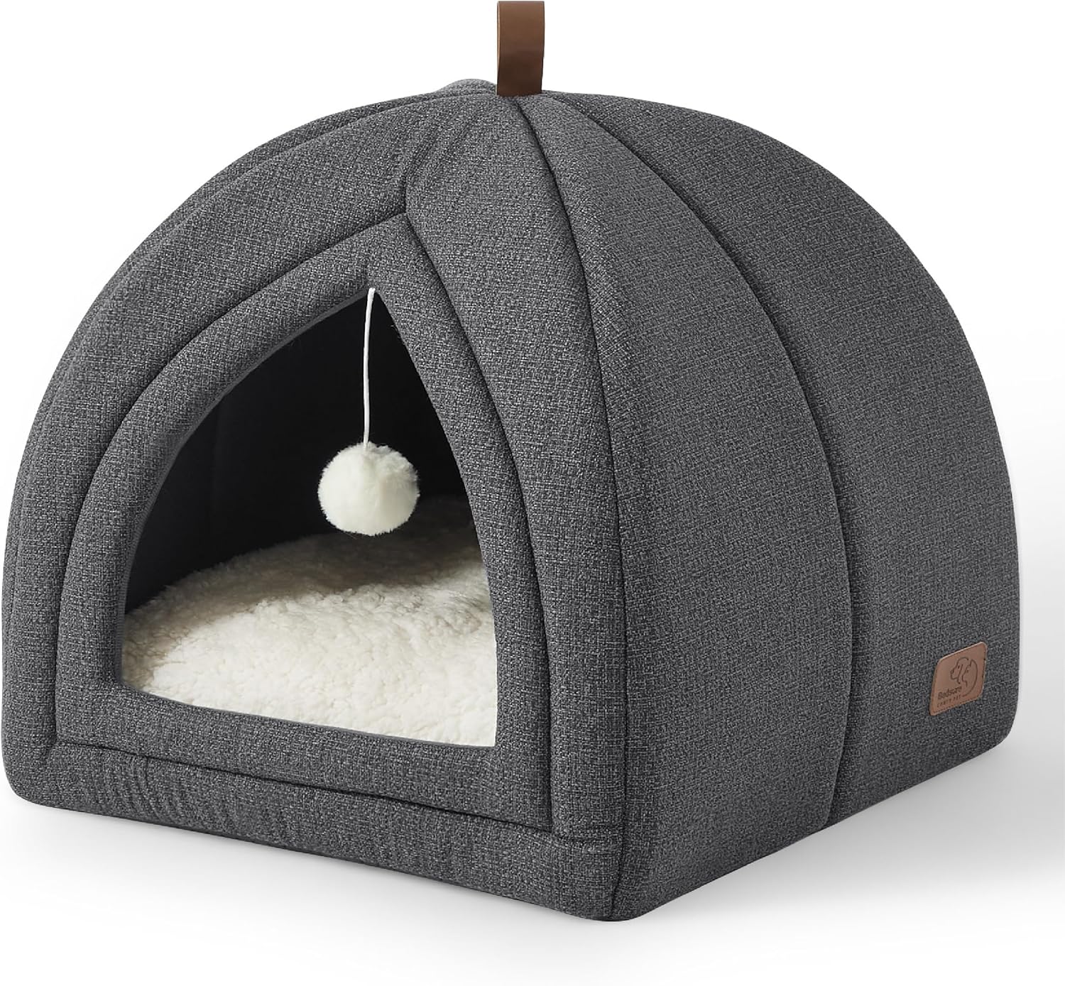 Котешко легло BEDSURE, голямо, котешка пещера, 44 x 44 x 44 см, вътрешна къщичка за котки с подвижна възглавница за котки шерпа и висяща играчка, пере се, бежово