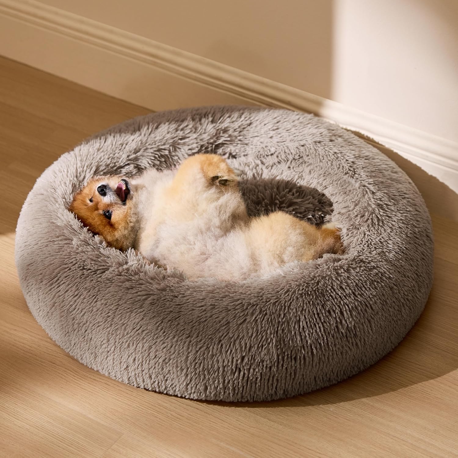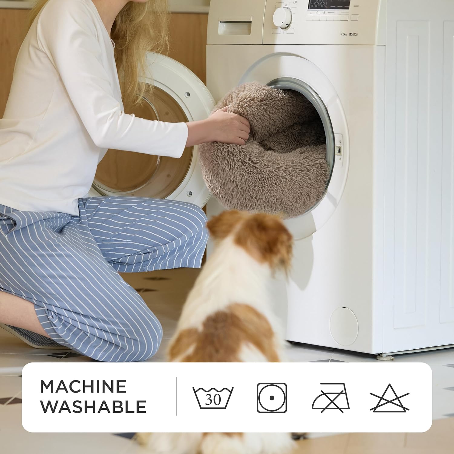Котешко легло Bedsure, Може да се пере, Пухкаво котешко легло – Диаметър 60 см, Място за спане на котки и малки кучета, Плюшена котешка възглавница, Кръгло, Гушкаво легло, Камилско