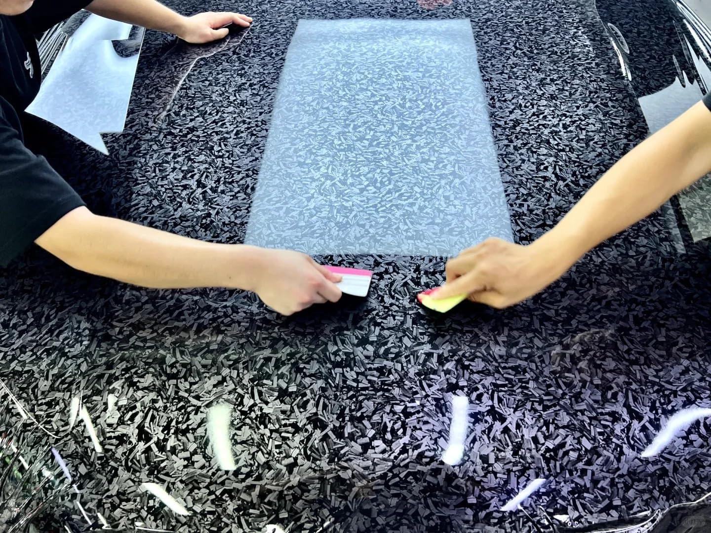 Инструкции за монтаж: 1. Почистете повърхността с медицински спирт преди монтаж на винила, за да подобрите адхезията и да премахнете замърсителите, които биха могли да причинят несъвършенства. 2. Използването на пистолет за горещ въздух може да улесни монтажа, като направи винила по-гъвкав и помогне за премахване на гънки. 3. Мека гумена гъба ще помогне за премахване на мехурчета и гънки.