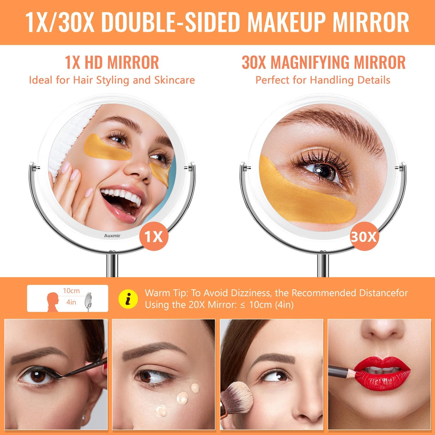 • 1X/30X: Двустранното козметично огледало Auxmir има 1x HD огледало и 30x увеличително огледало. Идеално за ежедневен грим и грижа за лицето, като например скубане на вежди, нанасяне на червило, бръснене и носене на контактни лещи.