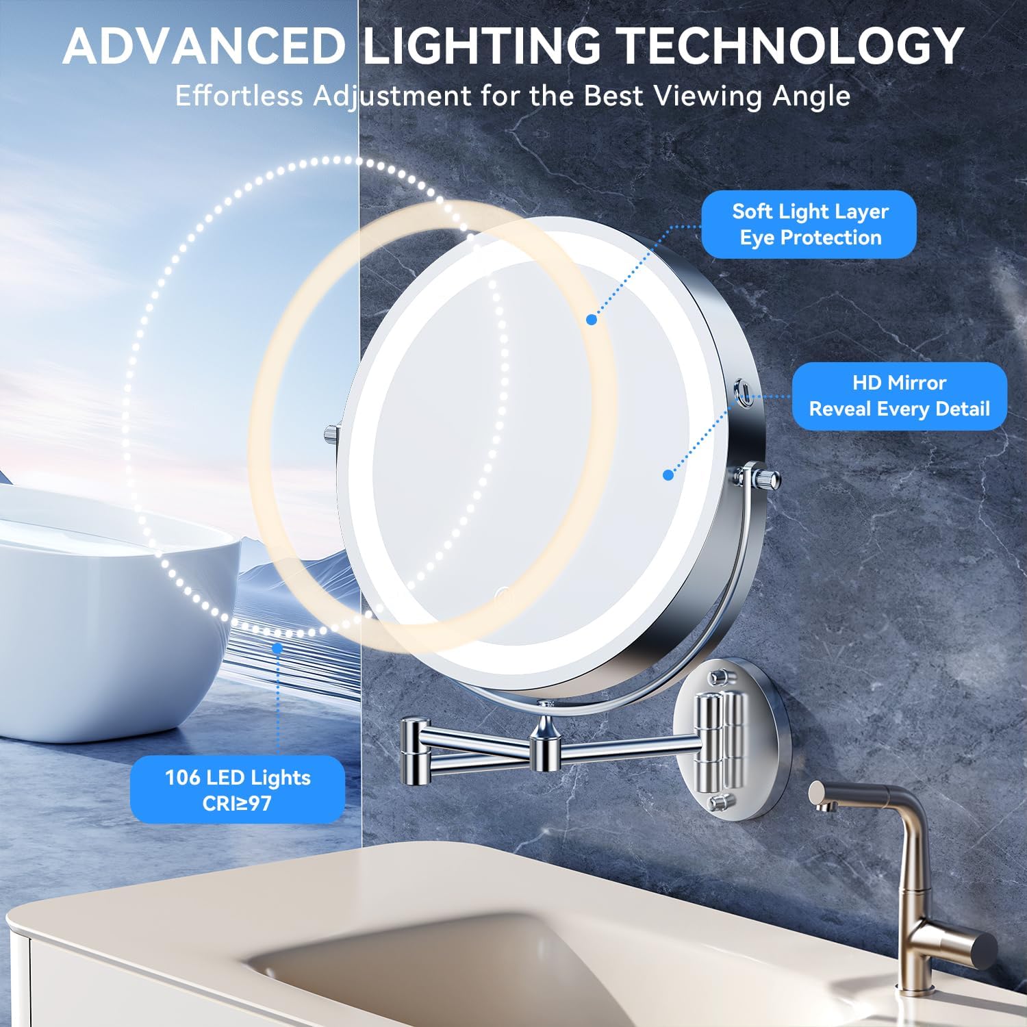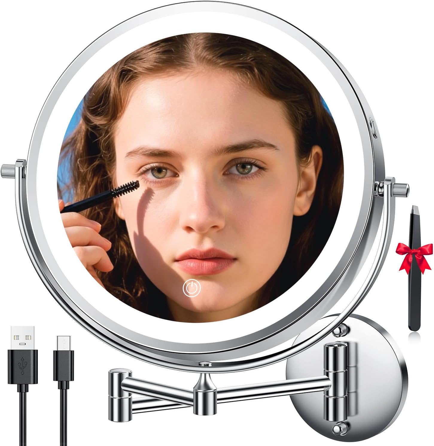 Козметично огледало Auxmir с осветление, 1X/30X акумулаторно огледало за грим, огледало за бръснене 5000 mAh за стенен монтаж, 10-инчово димируемо увеличително огледало с 3 цвята на светлината, въртящо се на 360° за баня