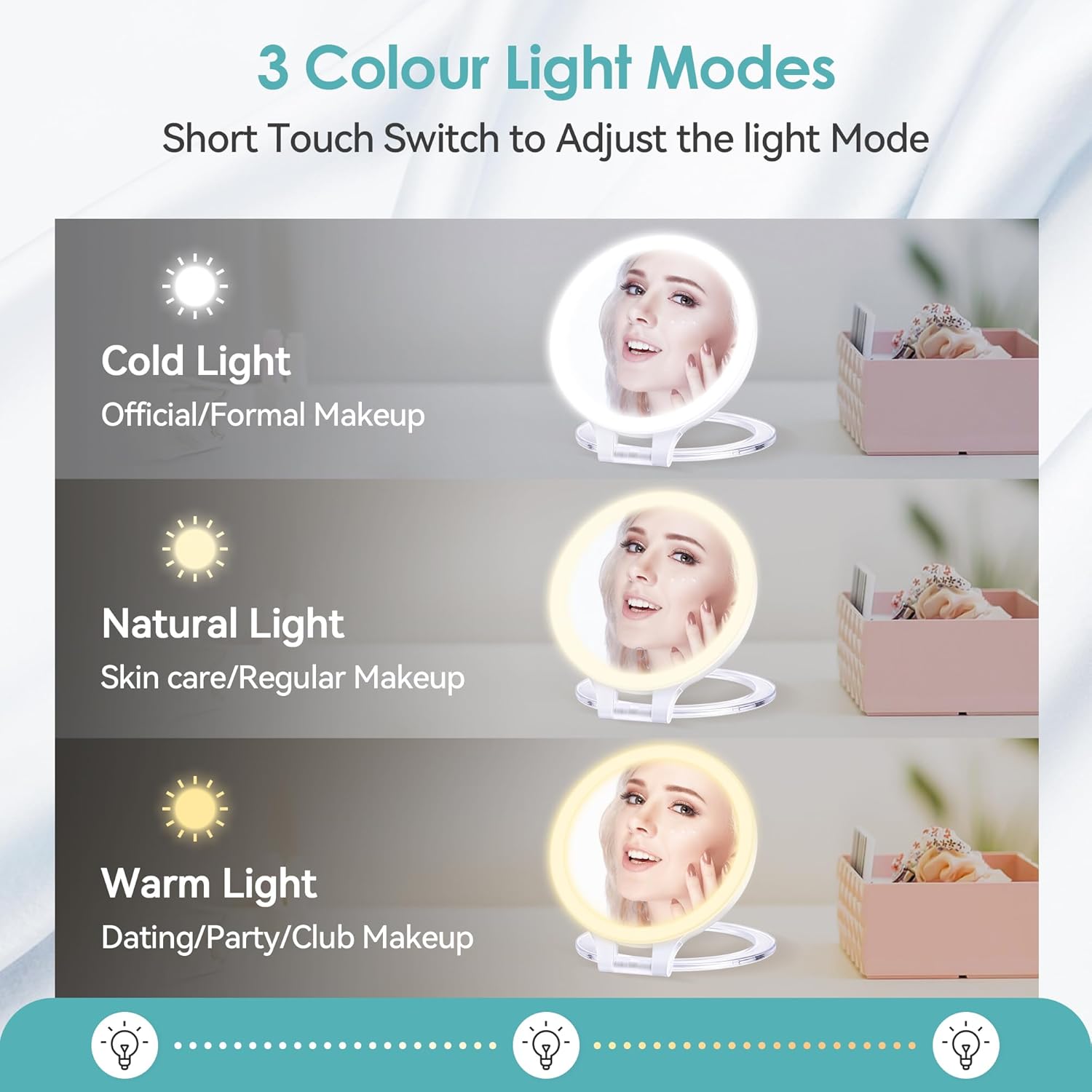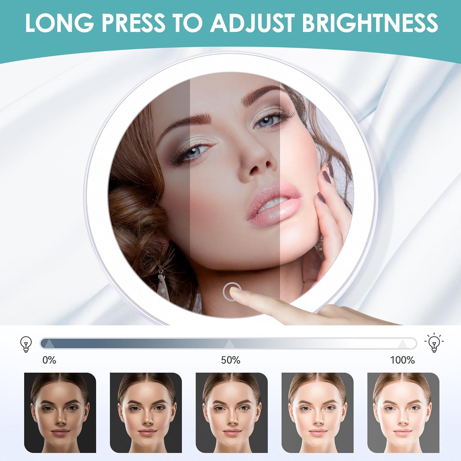 • Регулируема яркост и сензорно управление: огледалото за грим за пътуване има чувствително сензорно управление, натиснете превключвателя на екрана, за да промените цвета на светлината, могат да се превключват 3 цвята; задръжте превключвателя на екрана по-дълго, яркостта е слаба или ярка, а яркостта се променя между 100%, 80%, 50%, 20%.