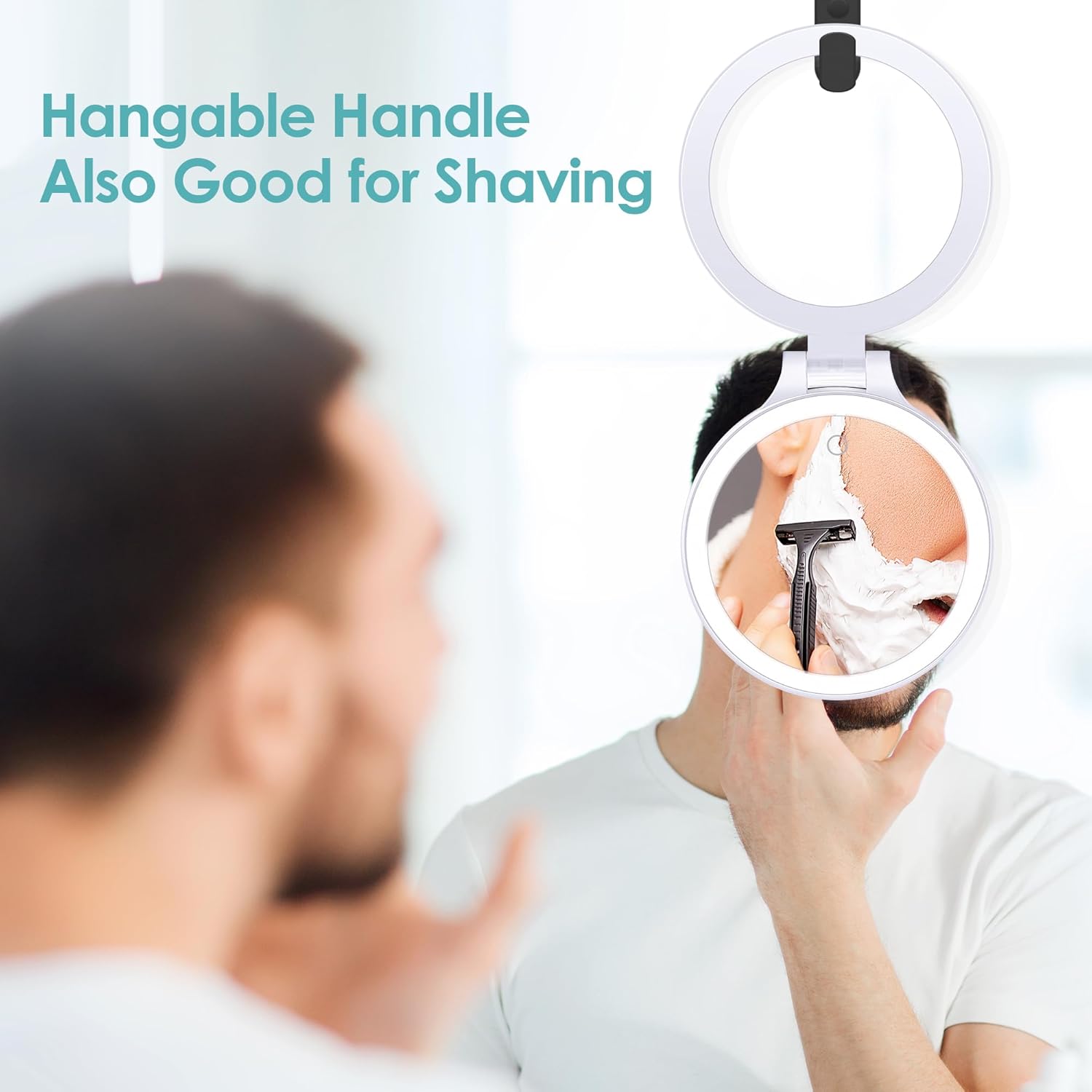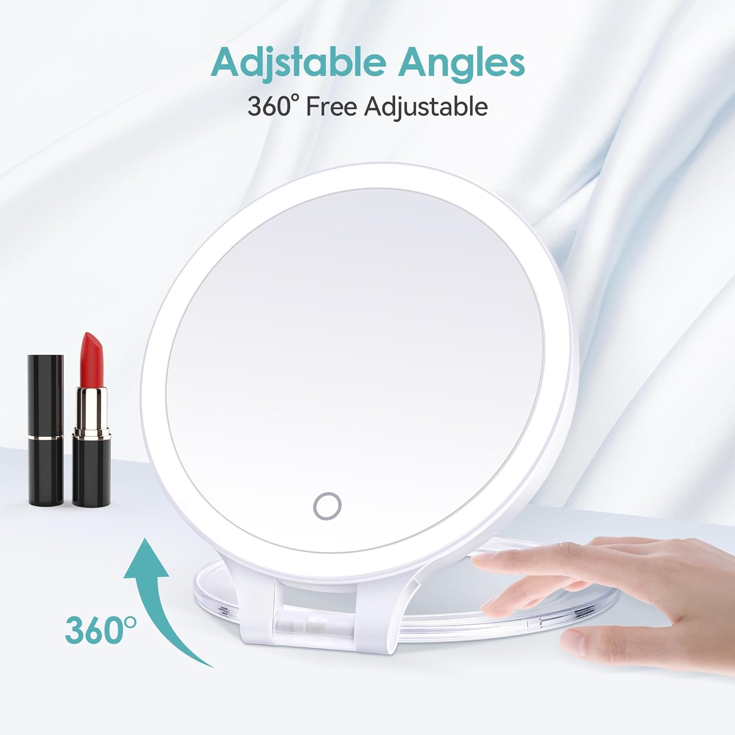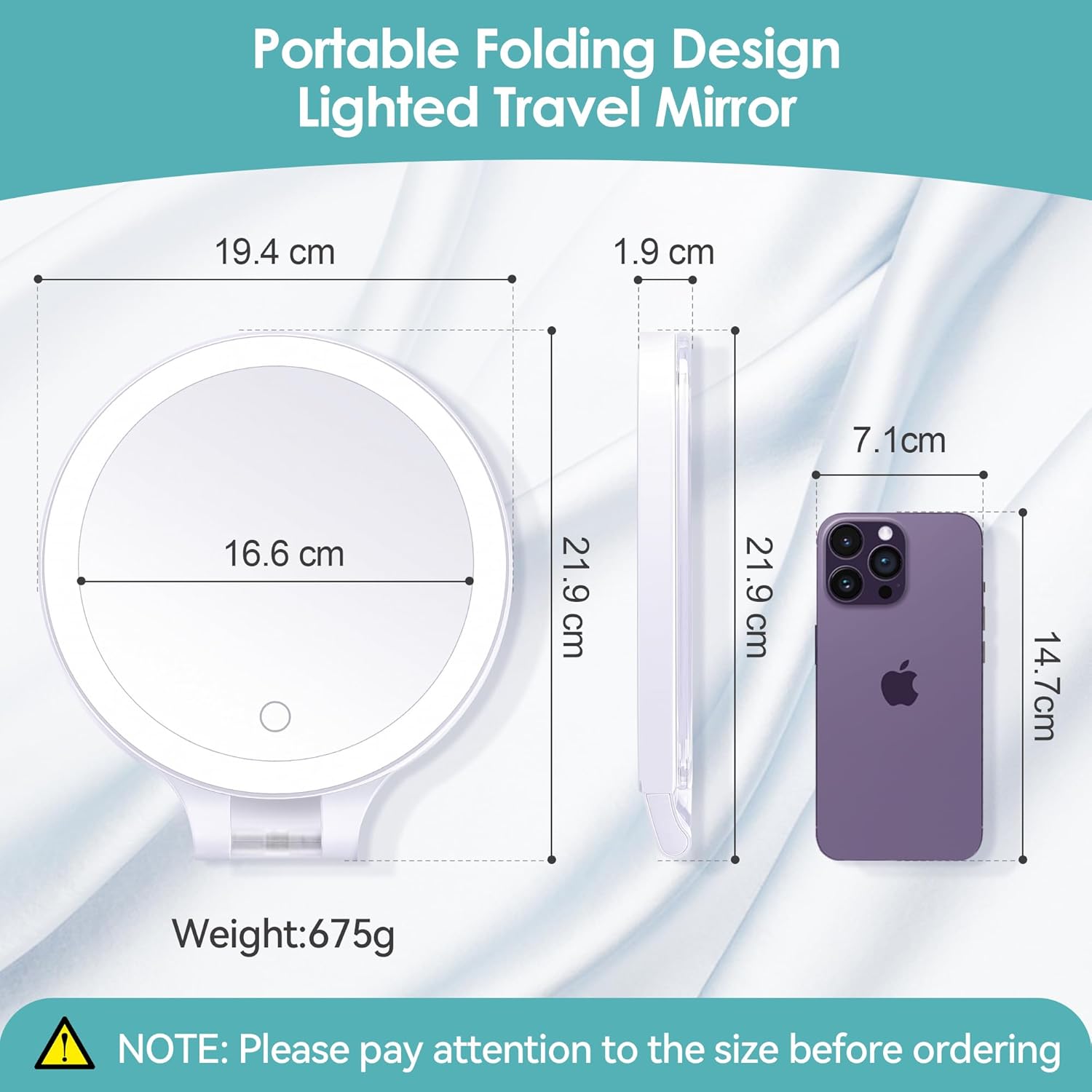 • Елегантно и преносимо: нашето преносимо огледало за пътуване с осветление и увеличение има елегантен външен вид, с лъскав бял корпус, хромирана стойка и стилен модерен дизайн. Настолното огледало с осветление тежи само 428 г и има диаметър 18 см. То е леко и удобно, така че можете лесно да го съхранявате в дамска чанта, чанта през рамо, раница или куфар и много други.