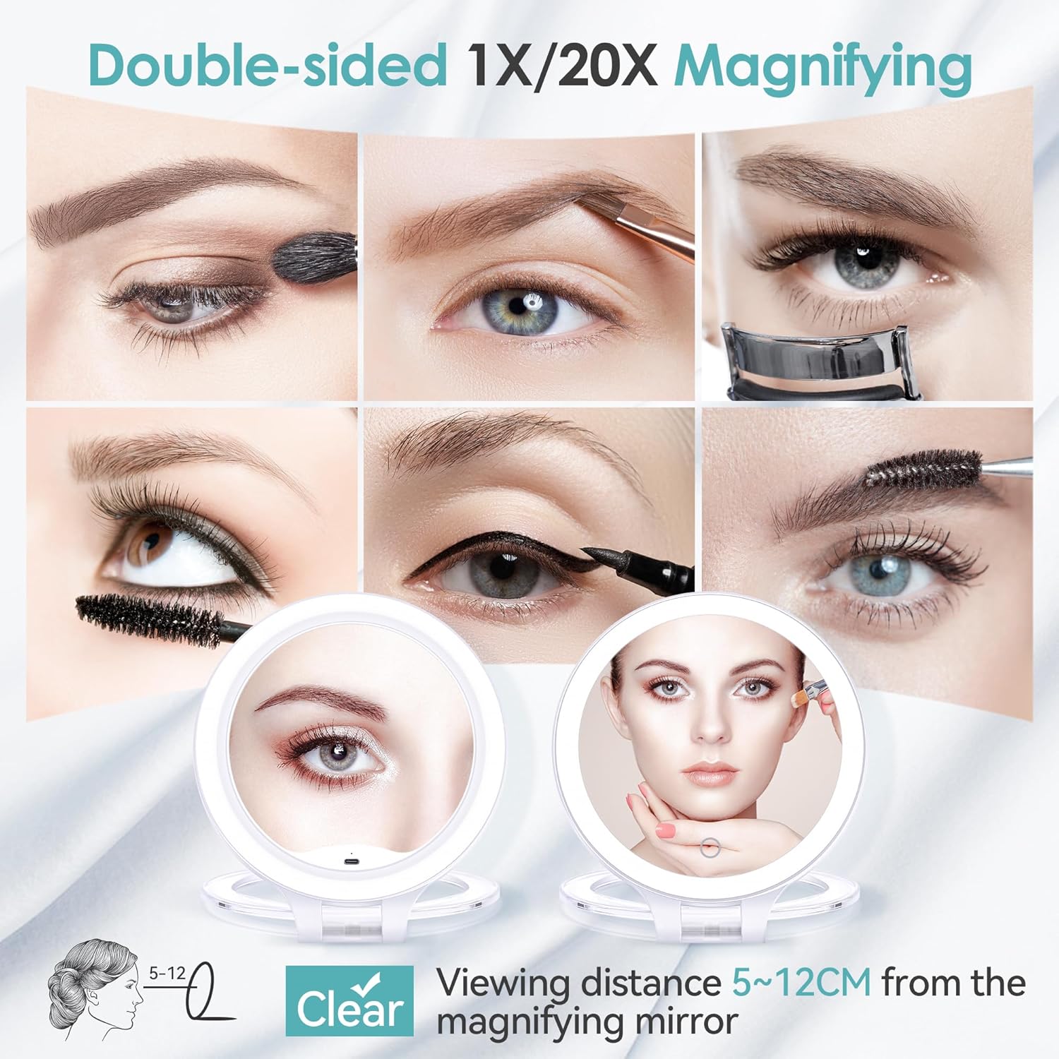 • Двустранно увеличение 1x и 30x: можете лесно да превключвате между огледало с 30x увеличение и нормален изглед 1x без изкривявания. Спестете ценно място на бюрото с този кръгъл дизайн на огледалото. Огледалото с 20x увеличение е мощно, няма да пропуснете размазан грим на очите, невидими петна, разпиляна коса или малки следи между зъбите.