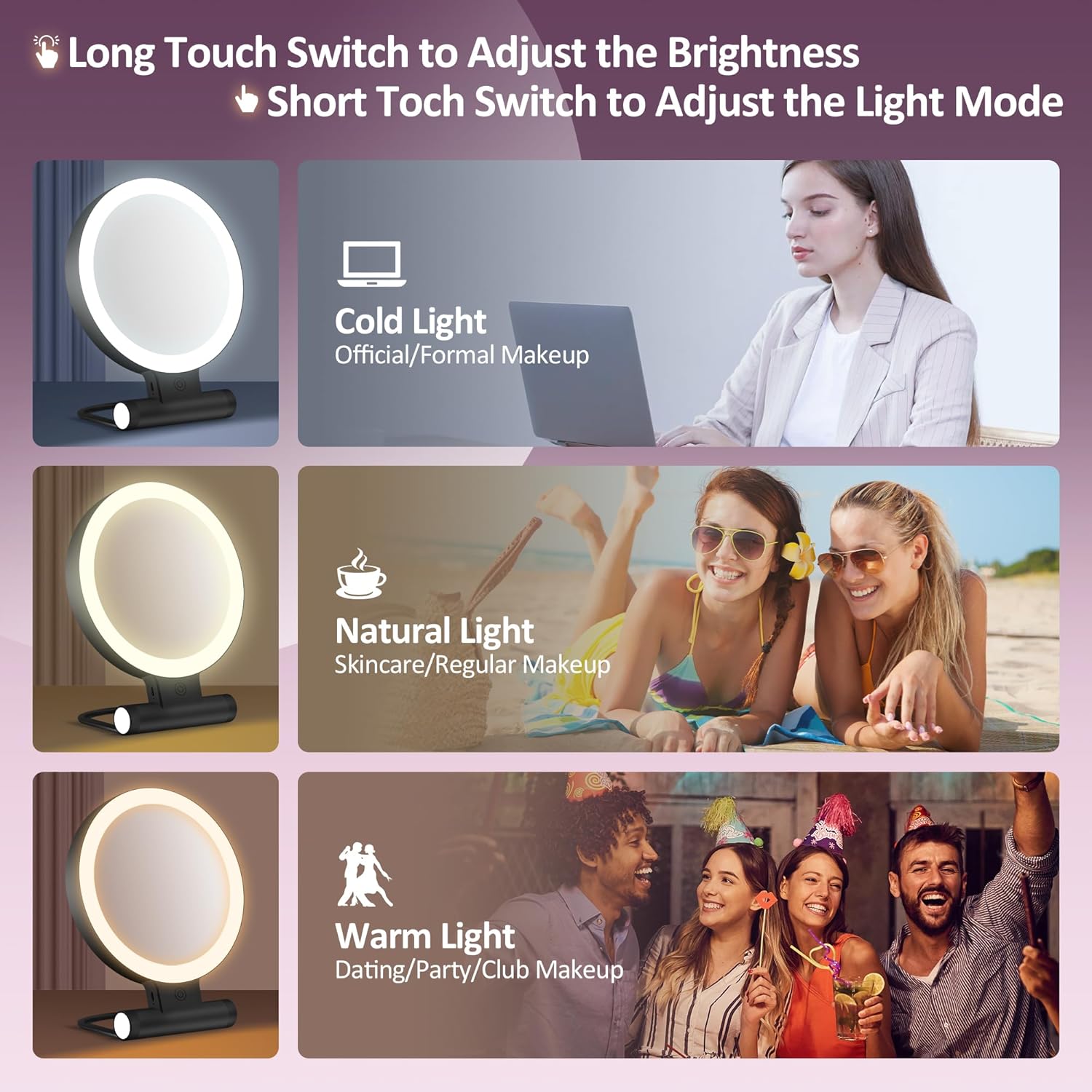 • Регулируема яркост и сензорно управление: огледалото за грим за пътуване има чувствително сензорно управление, натиснете превключвателя на екрана, за да промените цвета на светлината, могат да се превключват 3 цвята; задръжте превключвателя на екрана по-дълго, яркостта е слаба или ярка, а яркостта се променя между 100%, 80%, 50%, 20%.