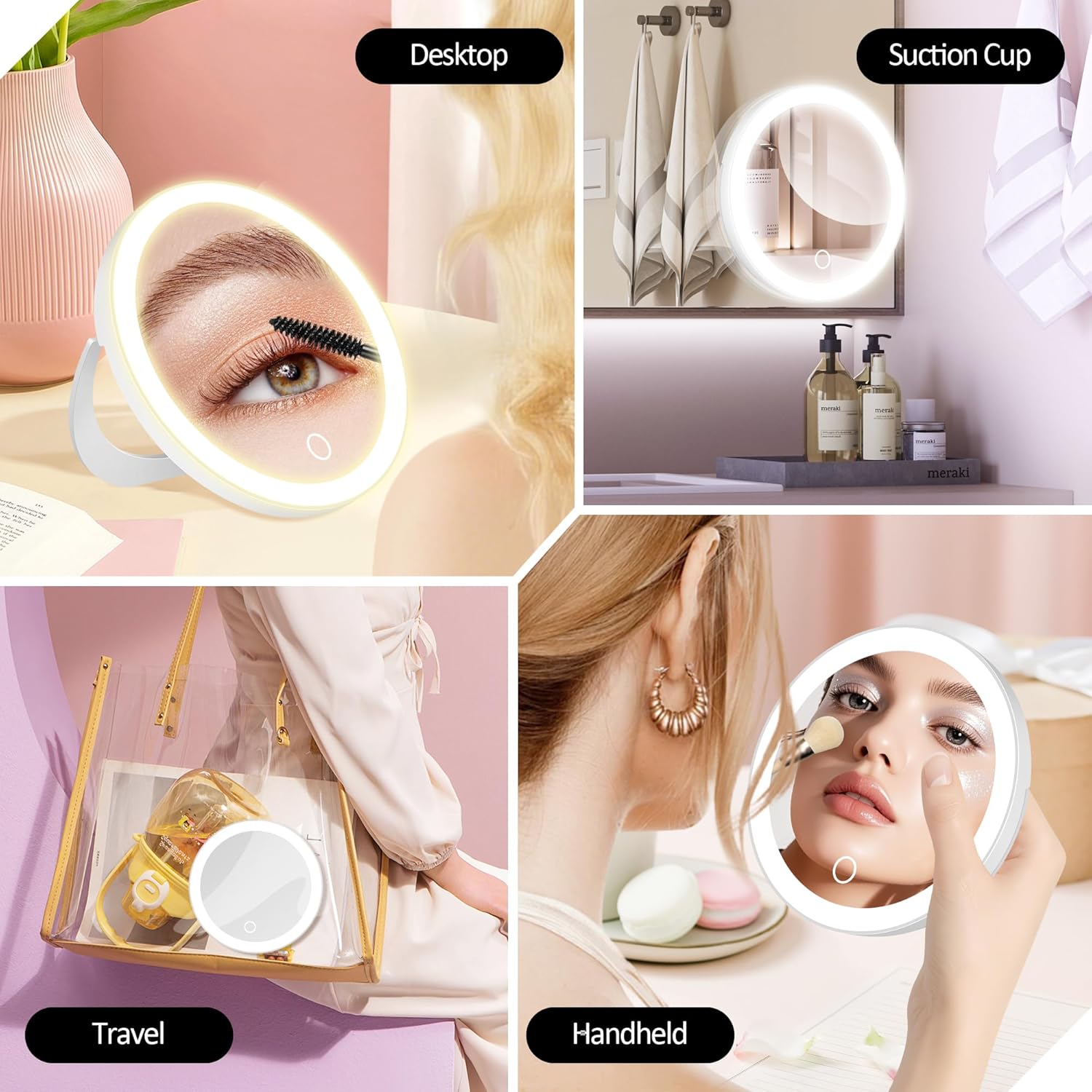 • 3 в 1 огледало за грим с осветление - Вендузи, стойка за стенен монтаж (фиксиран ъгъл) и дизайн за ръчно държане за всички сценарии. Монтира се на стена на куки/рафтове за тоалетка: употреба без ръце. Вендузите се залепват за гладки повърхности (плочки, стъкло, врати на гардероби) - идеално за прецизен грим или грижа за кожата. Стойката се стабилизира на бюро (грим); 30x увеличение - служи и като ръчен инструмент за корекции в движение.