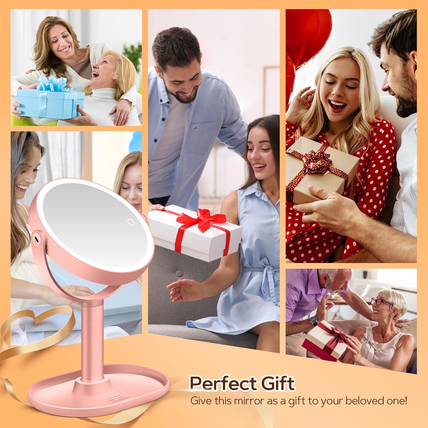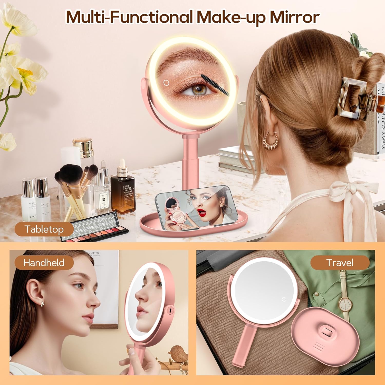 • Многофункционален дизайн на поставката: противоплъзгащата се поставка осигурява място за вашия смартфон - гледайте уроци за грим, докато се гримирате. Овалната основа служи и за пестене на място за съхранение на пинсети, червила и други козметични продукти. Сваля се и може да се използва като ръчно огледало, идеално за пътуване.