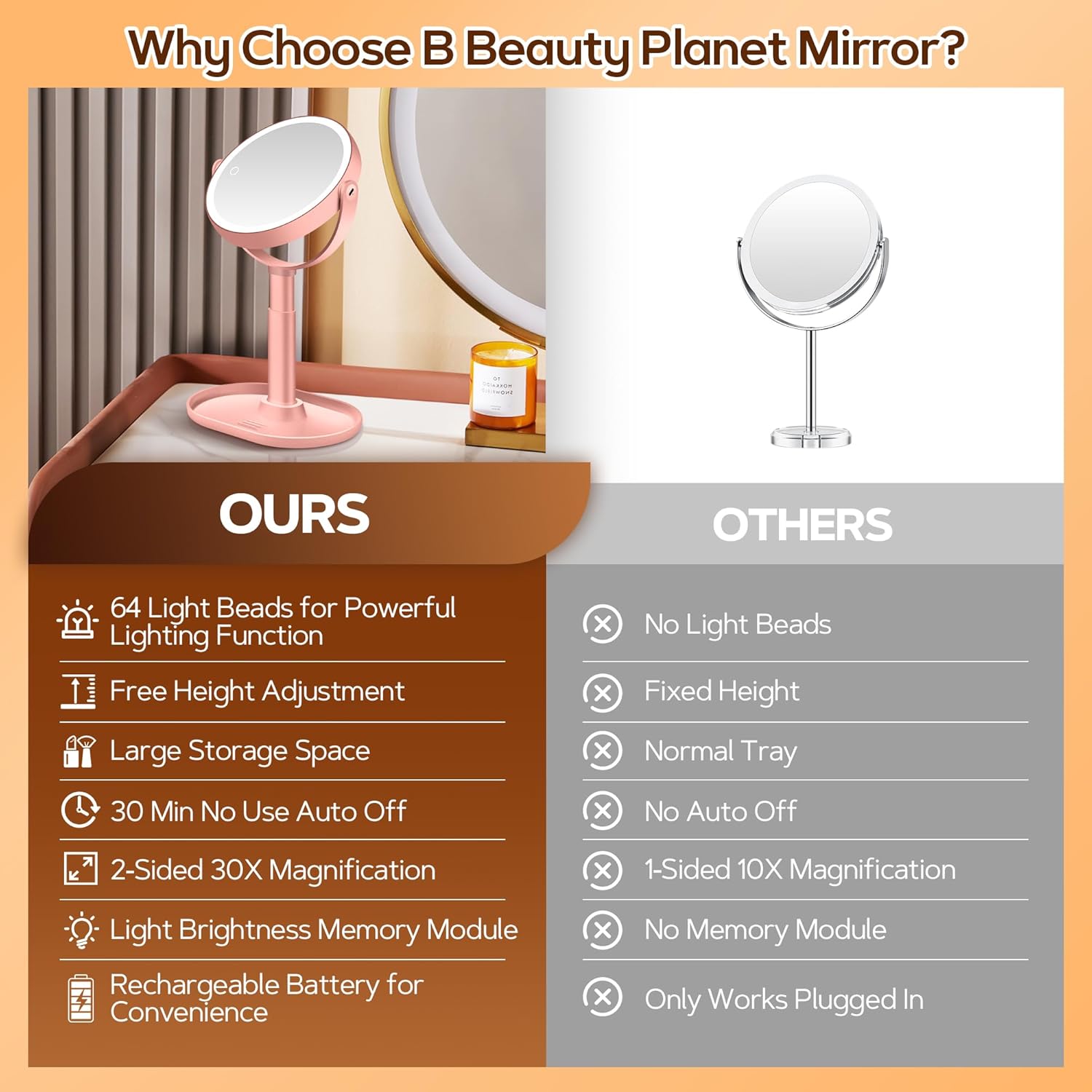 • Огледало за грим с 1/30x увеличение и осветление: това огледало за тоалетка има две огледала: огледало с 1x HD увеличение за ежедневен грим и огледало с 30x увеличение, което може без усилие да улови всеки детайл от лицето ви и да освети външния ви вид без слепи петна. Идеално за премахване на черни точки, нанасяне на очна линия или скубане на вежди. (Забележка: моля, спазвайте разстояние по-малко от 10 см, когато използвате увеличителното огледало, в противен случай може да причини отблясъци или размазани изображения)
