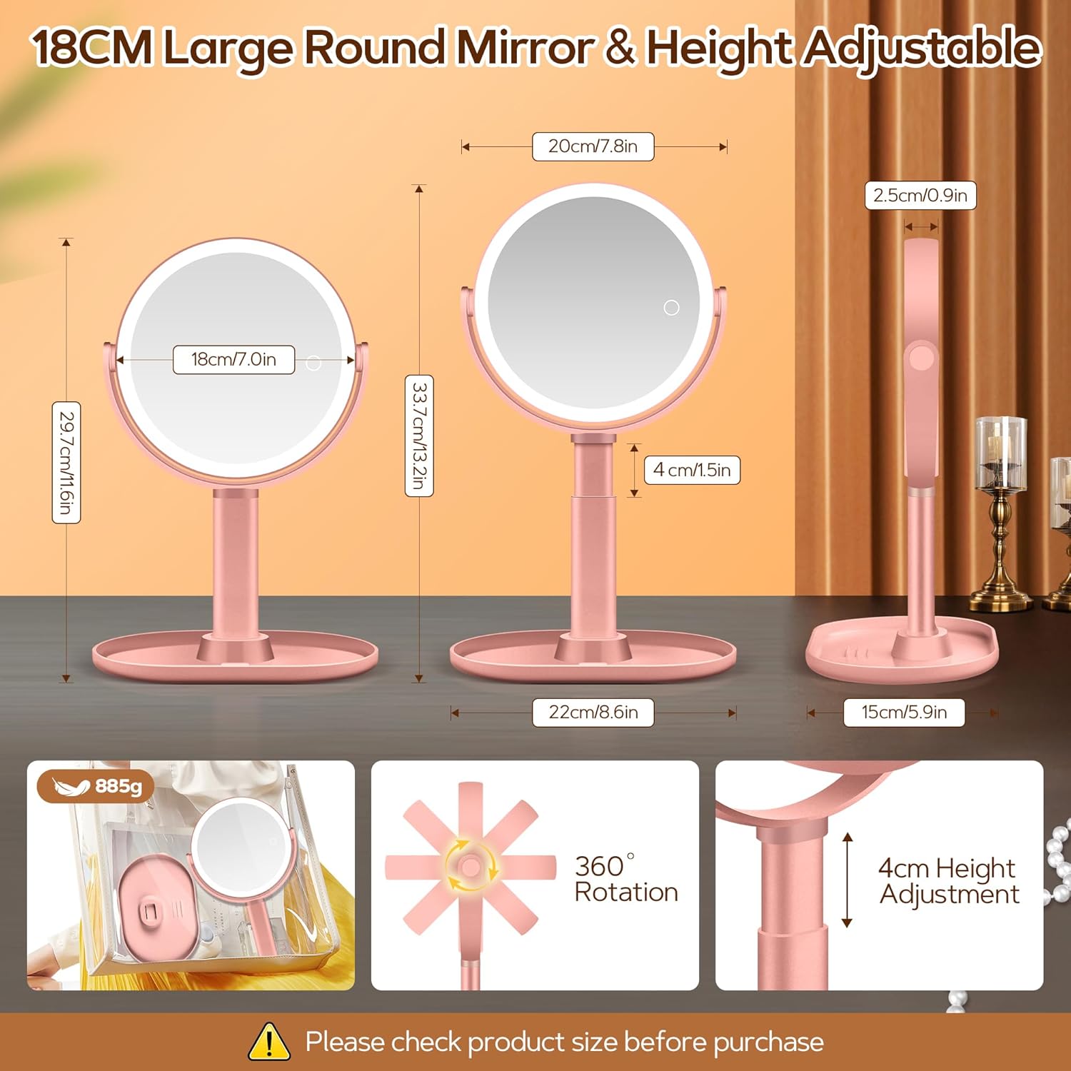 • Регулиране на височината и завъртане на 360°: благодарение на завъртане на 360° и регулируем по височина дизайн, огледалото се адаптира към всеки размер на тялото и ъгъл. Лесно намиране на позицията за грим за оптимално зрение. Ергономичният дизайн предотвратява мускулната умора при продължителна употреба. Идеално за тоалетки, хотели, стаи за пътуване и различни среди.