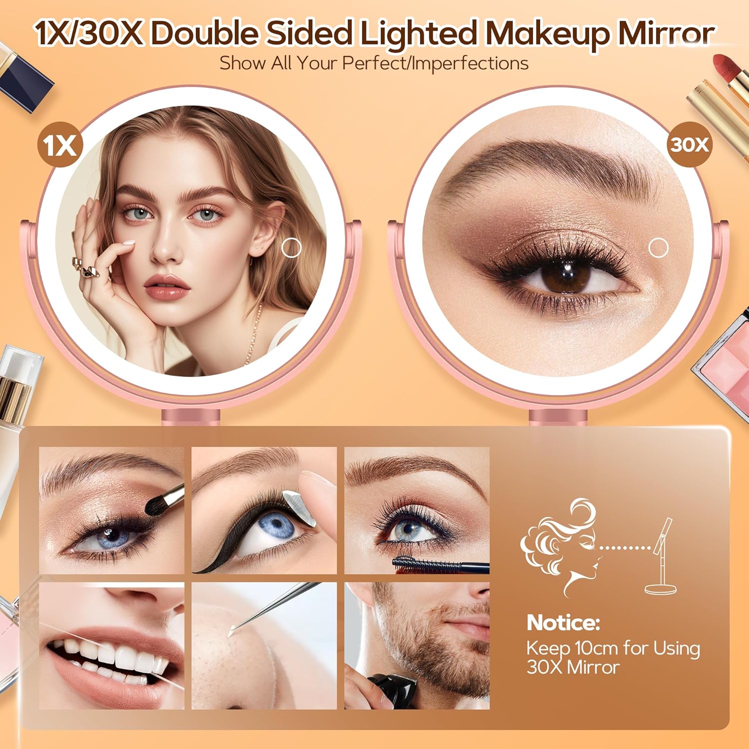 Козметично огледало с осветление, 30x двустранно, увеличително огледало с осветление, трицветен светлинен режим, регулируема яркост/височина, огледало за грим с осветление и увеличение, розово злато