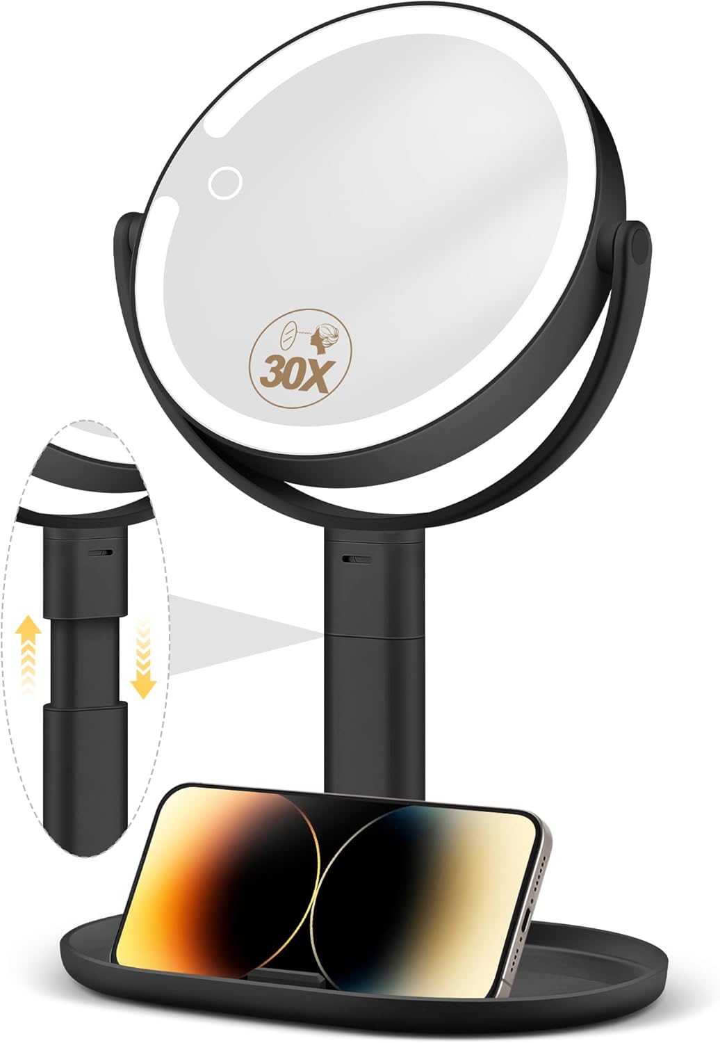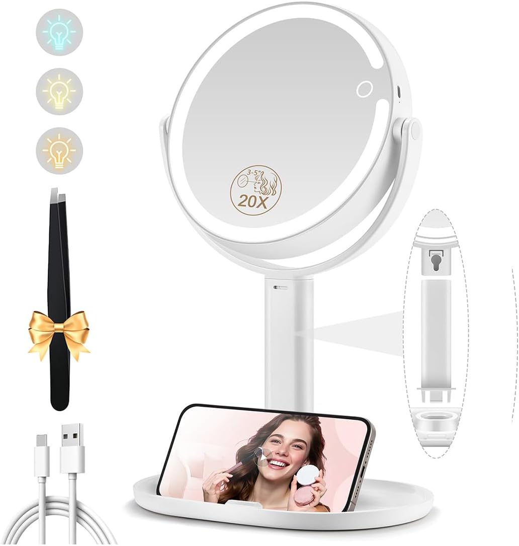• Многофункционален дизайн и основа за съхранение: огледалото с 20-кратно увеличение и осветление на стойката не само осигурява стабилна и добре осветена платформа, но и служи като място за съхранение на вашите ежедневни козметични принадлежности. С вградения държач за смартфон можете да се наслаждавате на видео чатове без ръце, стрийминг на живо и мултимедийно съдържание, докато без усилие организирате основните си козметични принадлежности. Поддържайте пространството си без излишни предмети и лесно достъпвайте червило, молив за вежди, четки за грим, гъби за грим и други козметични продукти, всичко на едно място.