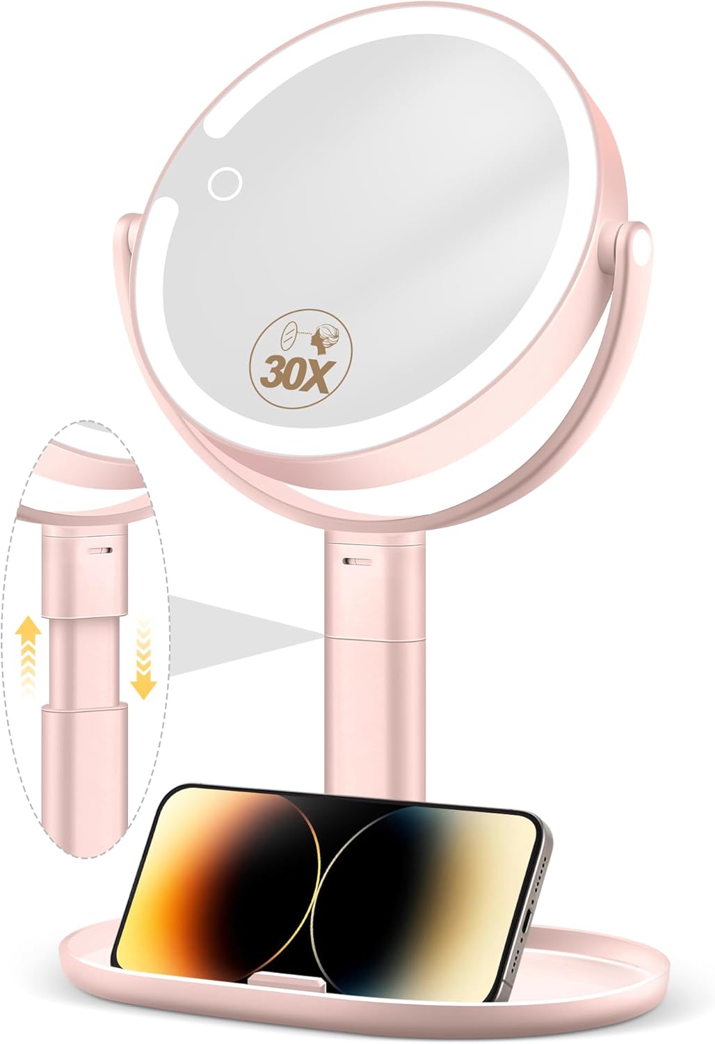Козметично огледало с осветление, увеличително огледало с 20x светлина, осветено от двете страни, регулируемо по височина увеличително огледало, 3-цветно козметично огледало за грим на маса, розово злато