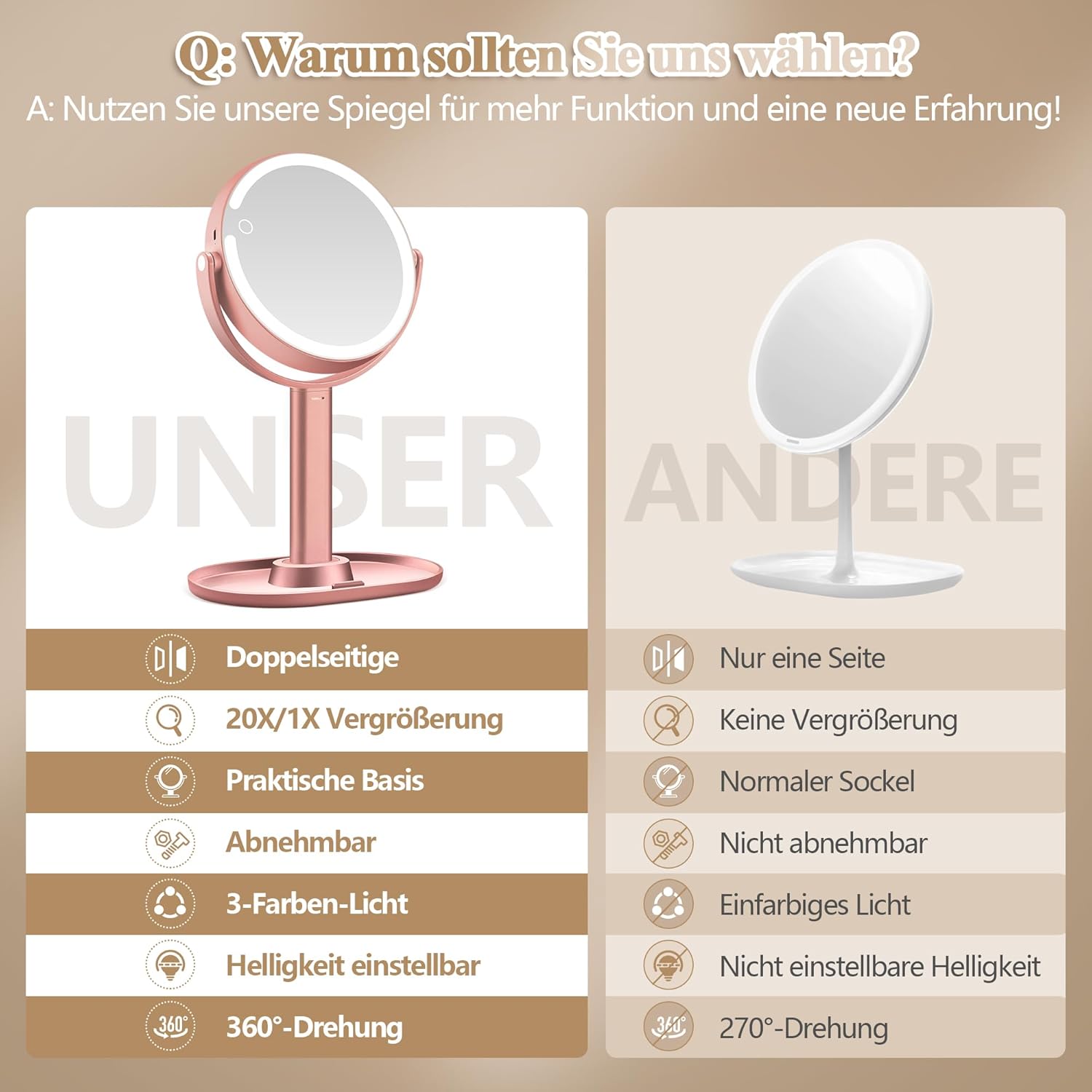 • 20X ОГЛЕДАЛО ЗА ГРИМ С ОСВЕТЛЕНИЕ: Огледалото за грим с 20x увеличение и осветление разполага с 1x и 20x осветено огледало за грим с въртящ се на 360° дизайн, идеално за нанасяне на грим, носене на контактни лещи, скубане на вежди, бръснене, стилизиране на коса или нанасяне на спирала. Просто превключвайте между увеличенията за обща употреба или за подробни задачи като вежди и очна линия. Насладете се на подобрена видимост и комфорт с това огледало за грим с увеличение.