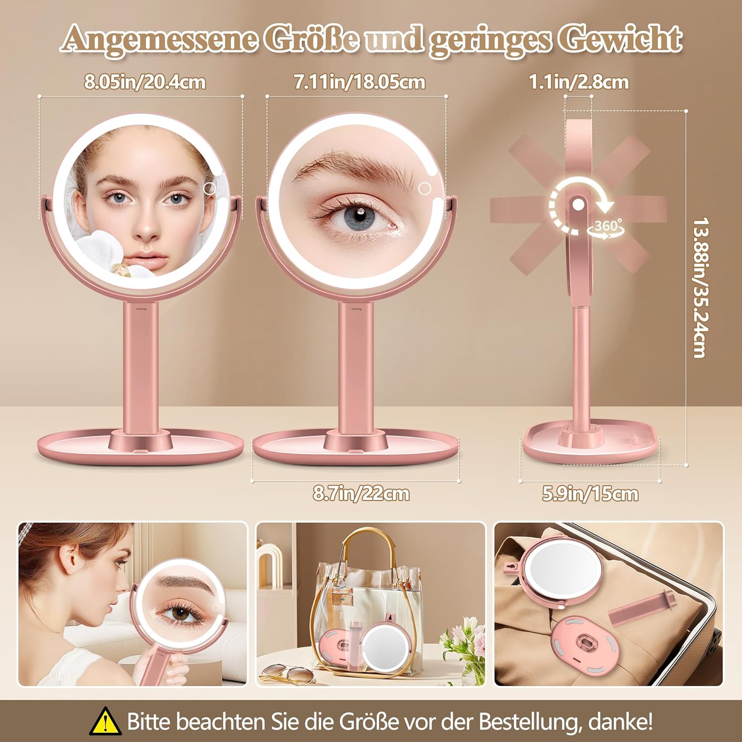 • Идеален подарък и широко приложение: LED козметичното огледало 20x е универсален гримьорски аксесоар, който може да се използва като настолен аксесоар, ръчно огледало за грим с осветление или акцент за окачване на стена. Плавен преход между тези три опции чрез регулиране на компонентите му. Независимо дали е рожден ден, годишнина или празник, нашето увеличително огледало е обмислен и практичен подарък. Стилният му дизайн и многофункционалните му функции го правят перфектен подарък за любителите на грима, пътуващите и всеки, който винаги иска да изглежда по най-добрия начин.