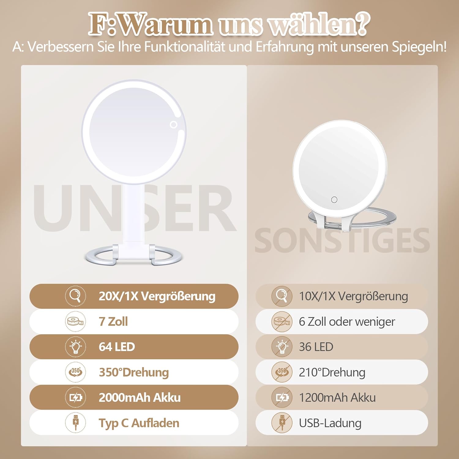 • 20X ОГЛЕДАЛО ЗА ГРИМ С ОСВЕТЛЕНИЕ: Огледалото за грим с 20x увеличение и осветление разполага с 1x и 20x осветено огледало за грим с въртящ се на 360° дизайн, идеално за нанасяне на грим, носене на контактни лещи, скубане на вежди, бръснене, стилизиране на коса или нанасяне на спирала. Просто превключвайте между увеличенията за обща употреба или за подробни задачи като вежди и очна линия. Насладете се на подобрена видимост и комфорт с това огледало за грим с увеличение.