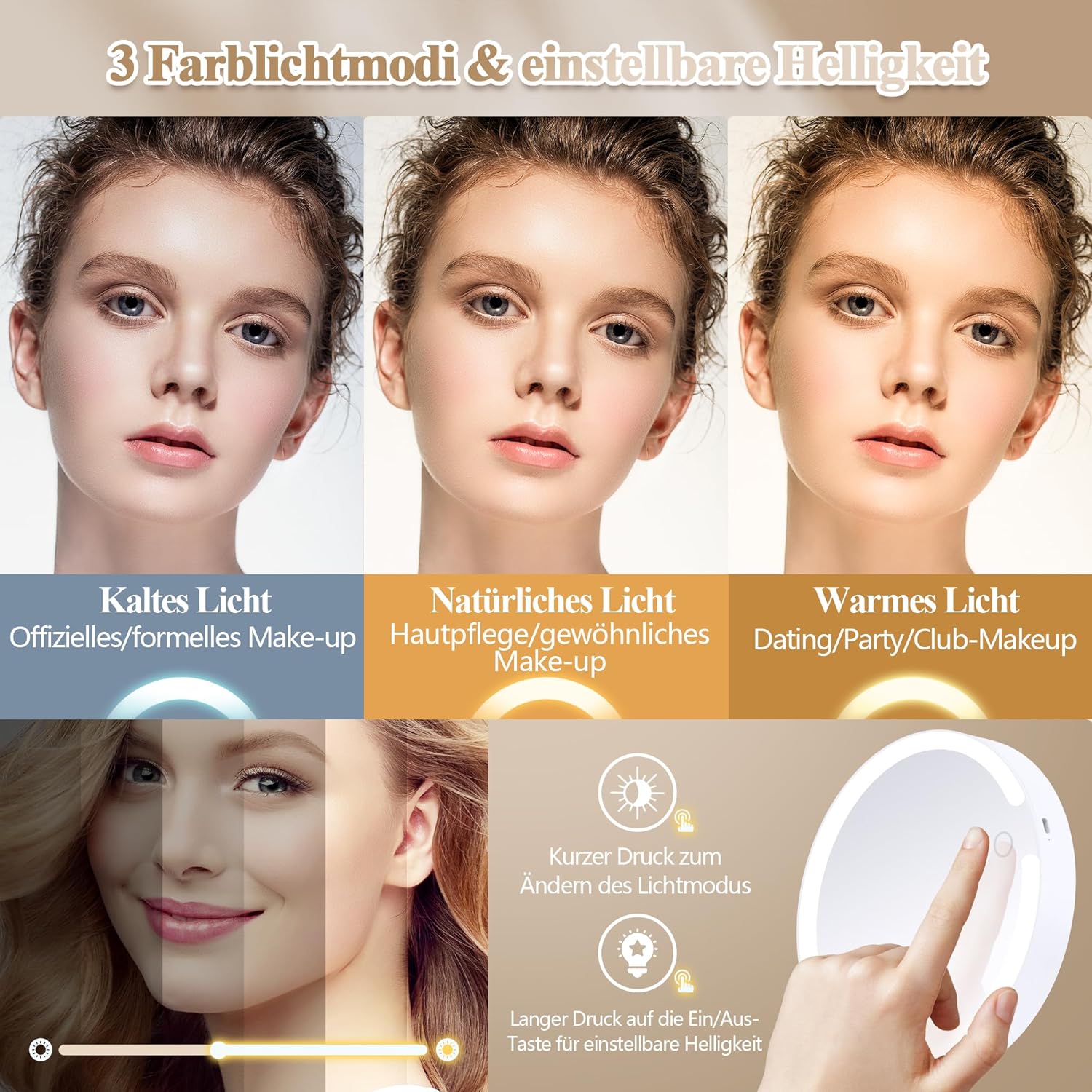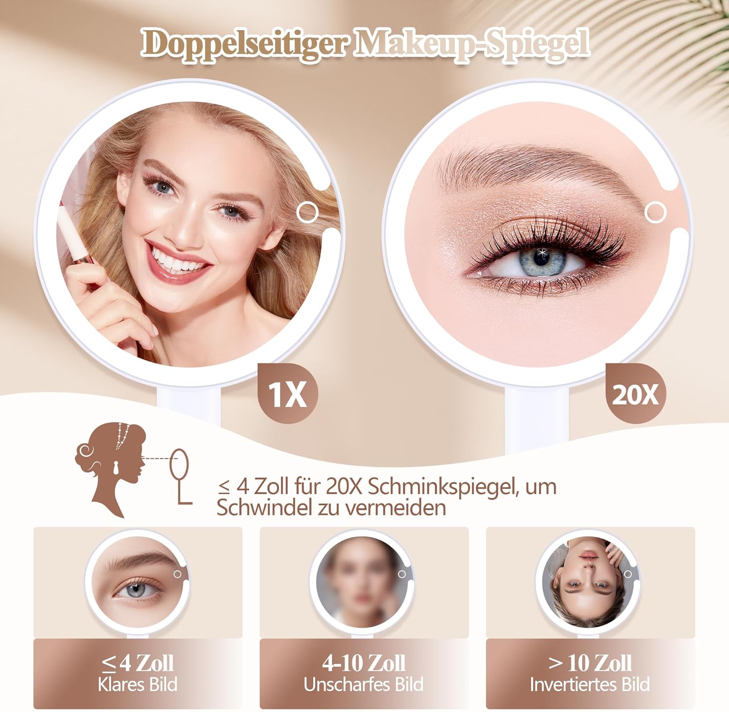 Козметично огледало с осветление, увеличително огледало с осветление, 20 x огледала за пътуване с осветление, огледало за грим с осветление, двустранно с 3 цветни светлини, стоящо огледало, ръчно/висящо/настолно