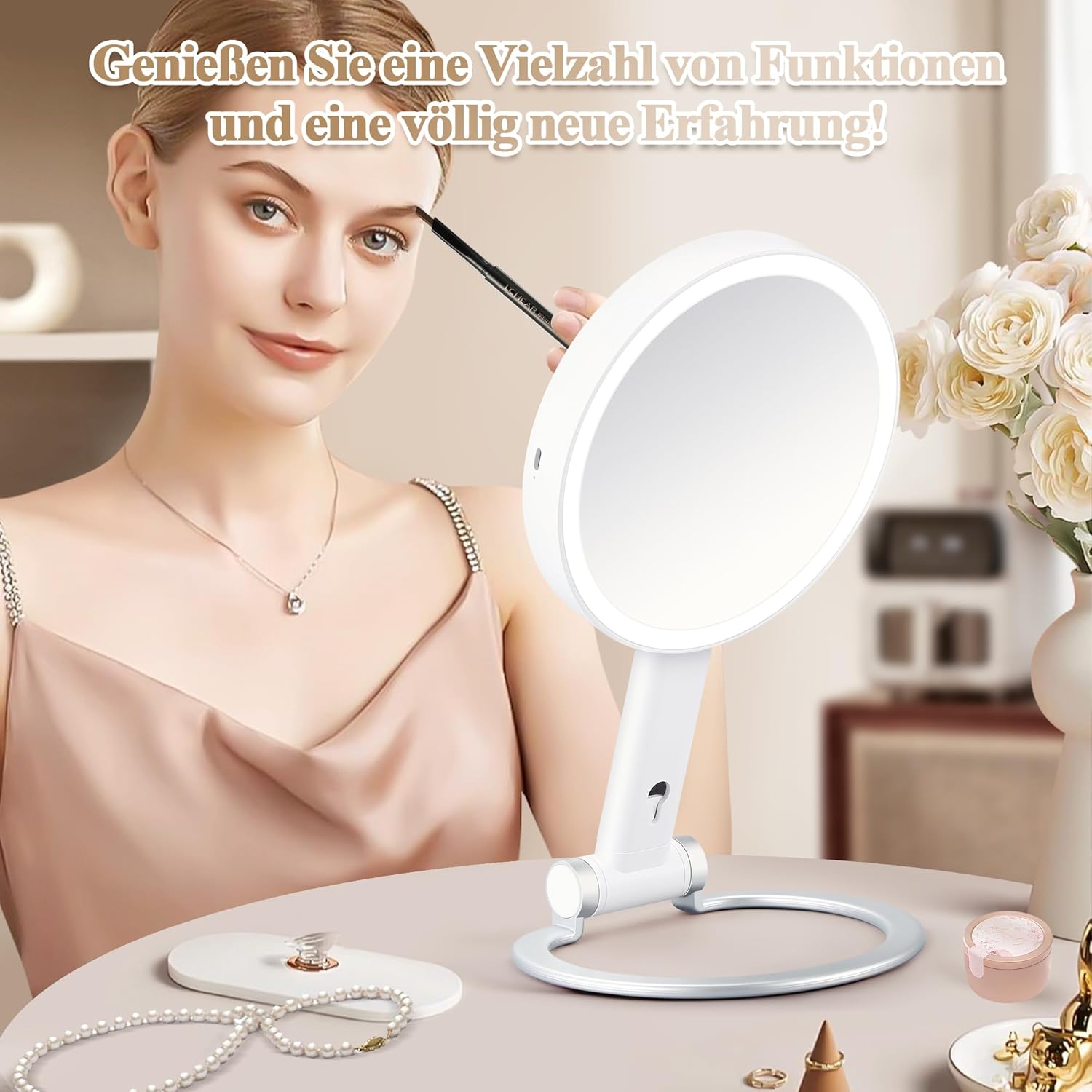 • Идеален подарък и широко приложение: LED козметичното огледало 20x е универсален гримьорски аксесоар, който може да се използва като настолен аксесоар, ръчно огледало за грим с осветление или акцент за окачване на стена. Плавен преход между тези три опции чрез регулиране на компонентите му. Независимо дали е рожден ден, годишнина или празник, нашето увеличително огледало е обмислен и практичен подарък. Стилният му дизайн и многофункционалните му функции го правят перфектен подарък за любителите на грима, пътуващите и всеки, който винаги иска да изглежда по най-добрия начин.