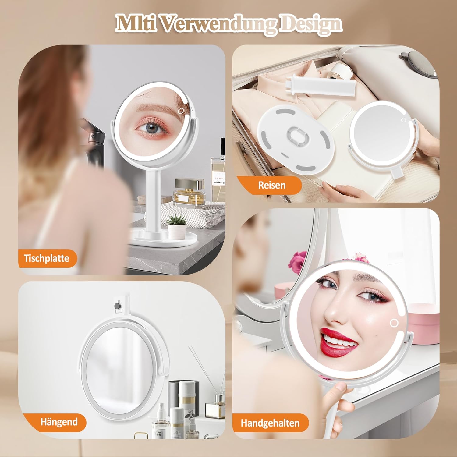 • Идеален подарък и широко приложение: LED козметичното огледало 20x е универсален гримьорски аксесоар, който може да се използва като настолен аксесоар, ръчно огледало за грим с осветление или акцент за окачване на стена. Плавен преход между тези три опции чрез регулиране на компонентите му. Независимо дали е рожден ден, годишнина или празник, нашето увеличително огледало е обмислен и практичен подарък. Стилният му дизайн и многофункционалните му функции го правят перфектен подарък за любителите на грима, пътуващите и всеки, който винаги иска да изглежда по най-добрия начин.