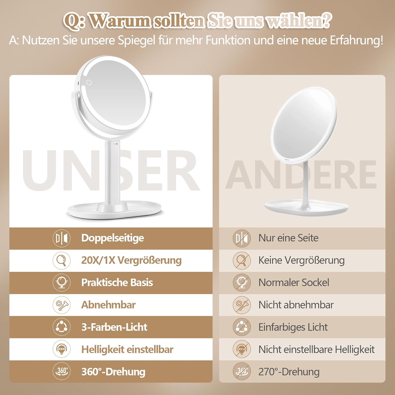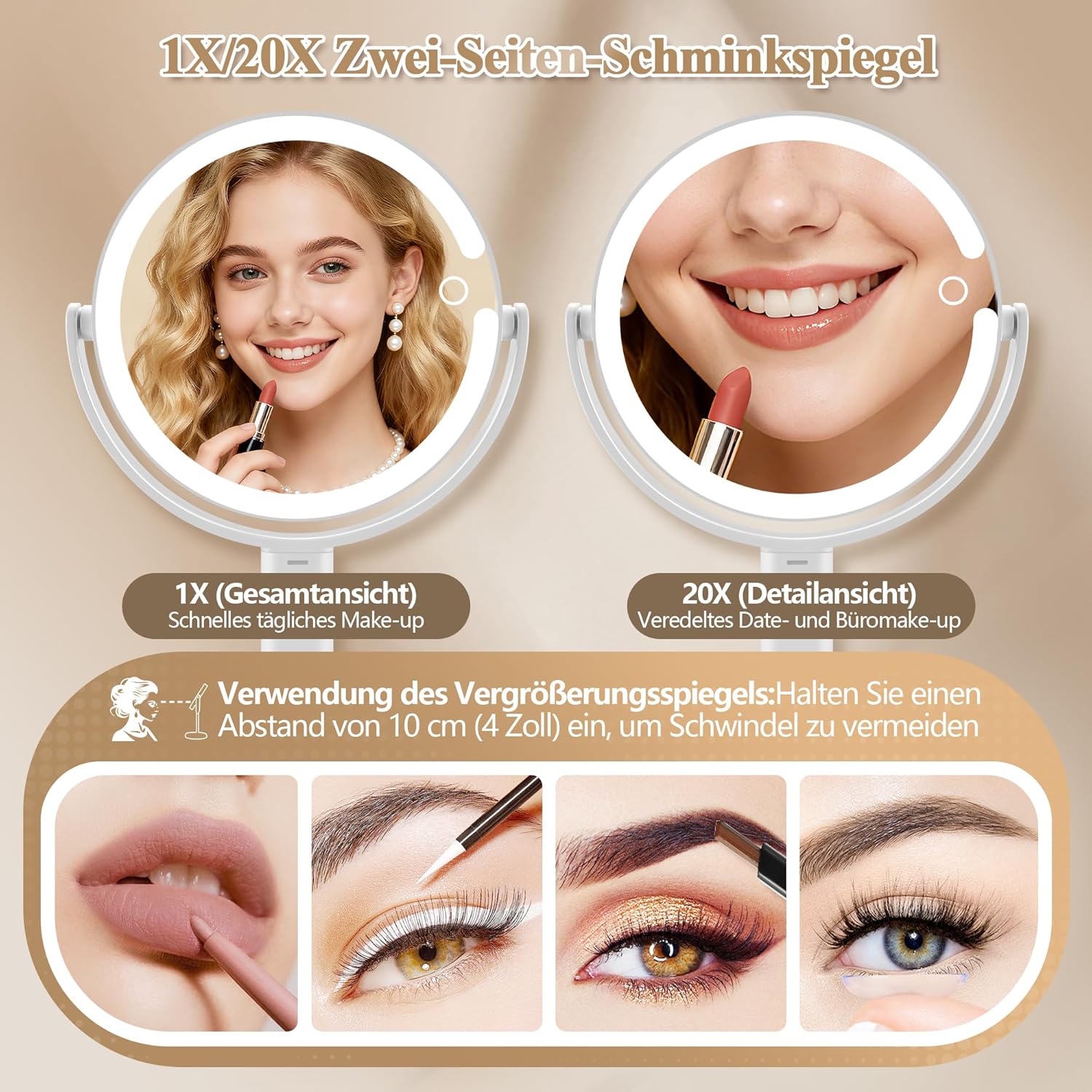 • 20X ОГЛЕДАЛО ЗА ГРИМ С ОСВЕТЛЕНИЕ: Огледалото за грим с 20x увеличение и осветление разполага с 1x и 20x осветено огледало за грим с въртящ се на 360° дизайн, идеално за нанасяне на грим, носене на контактни лещи, скубане на вежди, бръснене, стилизиране на коса или нанасяне на спирала. Просто превключвайте между увеличенията за обща употреба или за подробни задачи като вежди и очна линия. Насладете се на подобрена видимост и комфорт с това огледало за грим с увеличение.