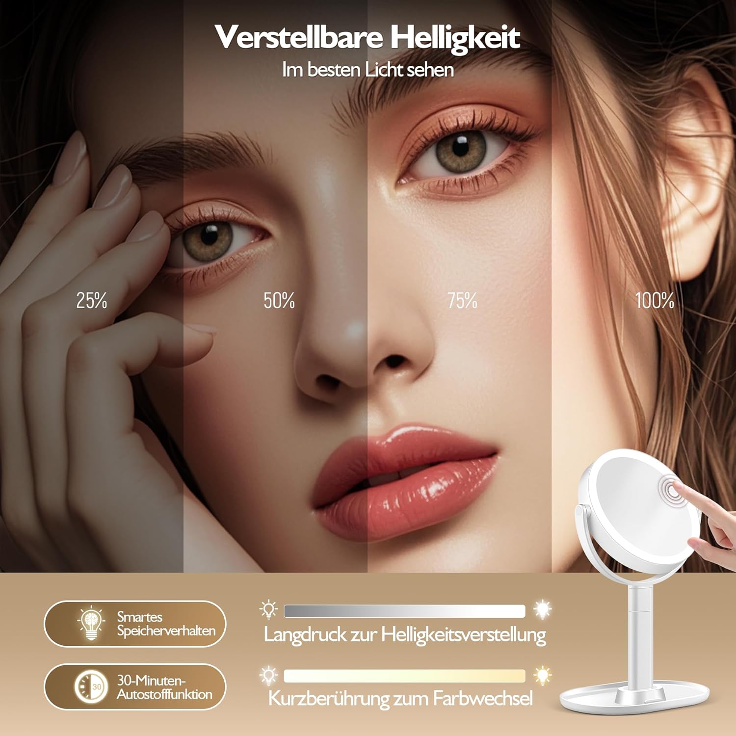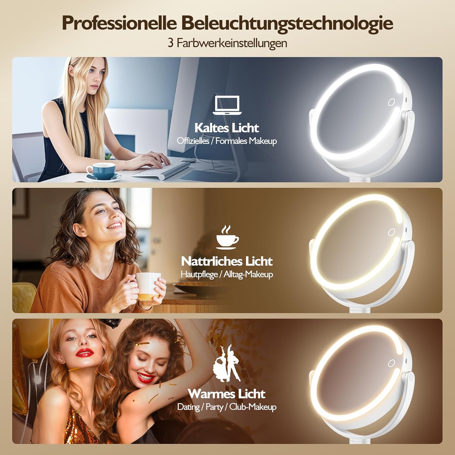 • 3-цветна светлина и безстепенно затъмняване: козметичното огледало с осветление има 64 високоинтензивни LED мъниста, които осигуряват три източника на светлина - студена, естествена и топла светлина, така че можете да превключвате между тях само с едно натискане на бутон. С безстепенното регулиране на яркостта можете лесно да създадете идеални условия на осветление за нанасяне на грим и да регулирате яркостта на козметичното огледало със светлина според всяка среда или повод.