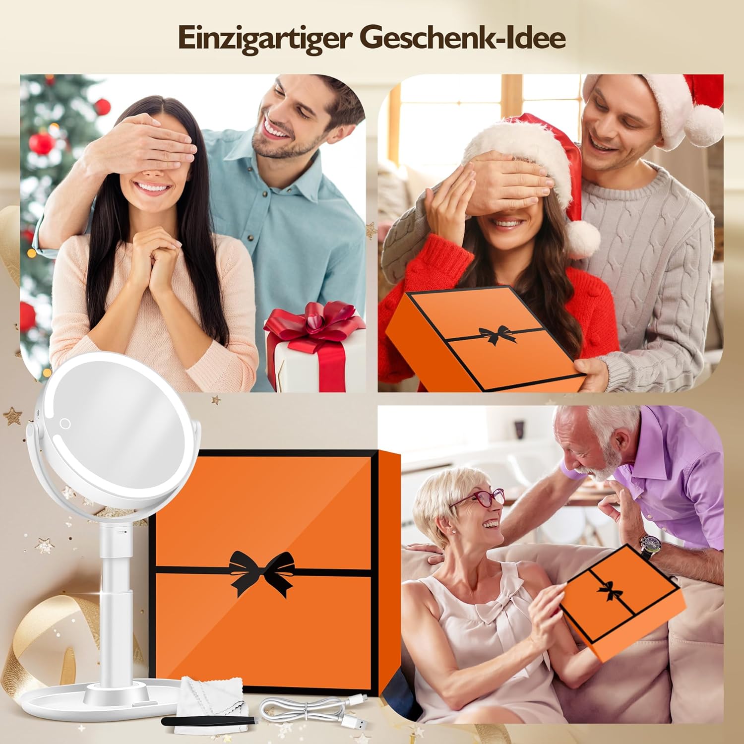 • Идеален подарък и широко приложение: LED козметичното огледало 20x е универсален гримьорски аксесоар, който може да се използва като настолен аксесоар, ръчно огледало за грим с осветление или акцент за окачване на стена. Плавен преход между тези три опции чрез регулиране на компонентите му. Независимо дали е рожден ден, годишнина или празник, нашето увеличително огледало е обмислен и практичен подарък. Стилният му дизайн и многофункционалните му функции го правят перфектен подарък за любителите на грима, пътуващите и всеки, който винаги иска да изглежда по най-добрия начин.