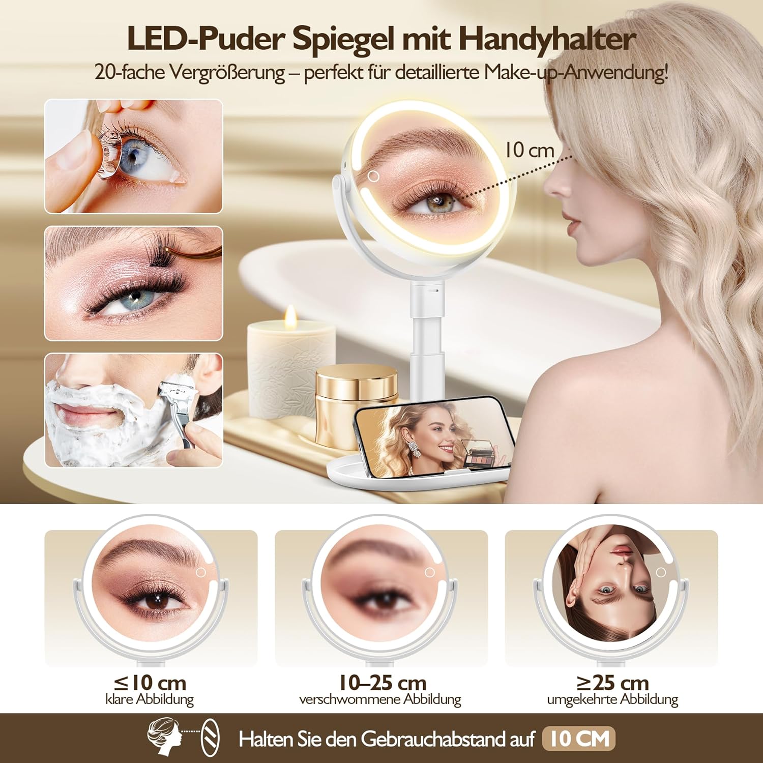 • Многофункционален дизайн и основа за съхранение: огледалото с 20-кратно увеличение и осветление на стойката не само осигурява стабилна и добре осветена платформа, но и служи като място за съхранение на вашите ежедневни козметични принадлежности. С вградения държач за смартфон можете да се наслаждавате на видео чатове без ръце, стрийминг на живо и мултимедийно съдържание, докато без усилие организирате основните си козметични принадлежности. Поддържайте пространството си без излишни предмети и лесно достъпвайте червило, молив за вежди, четки за грим, гъби за грим и други козметични продукти, всичко на едно място.