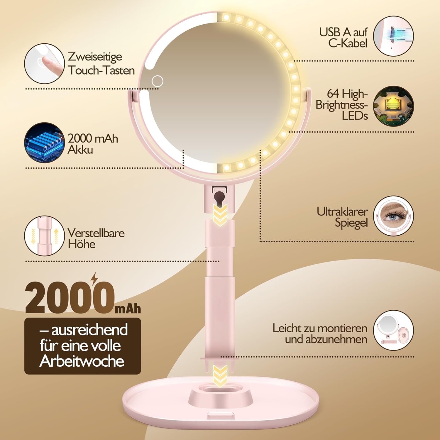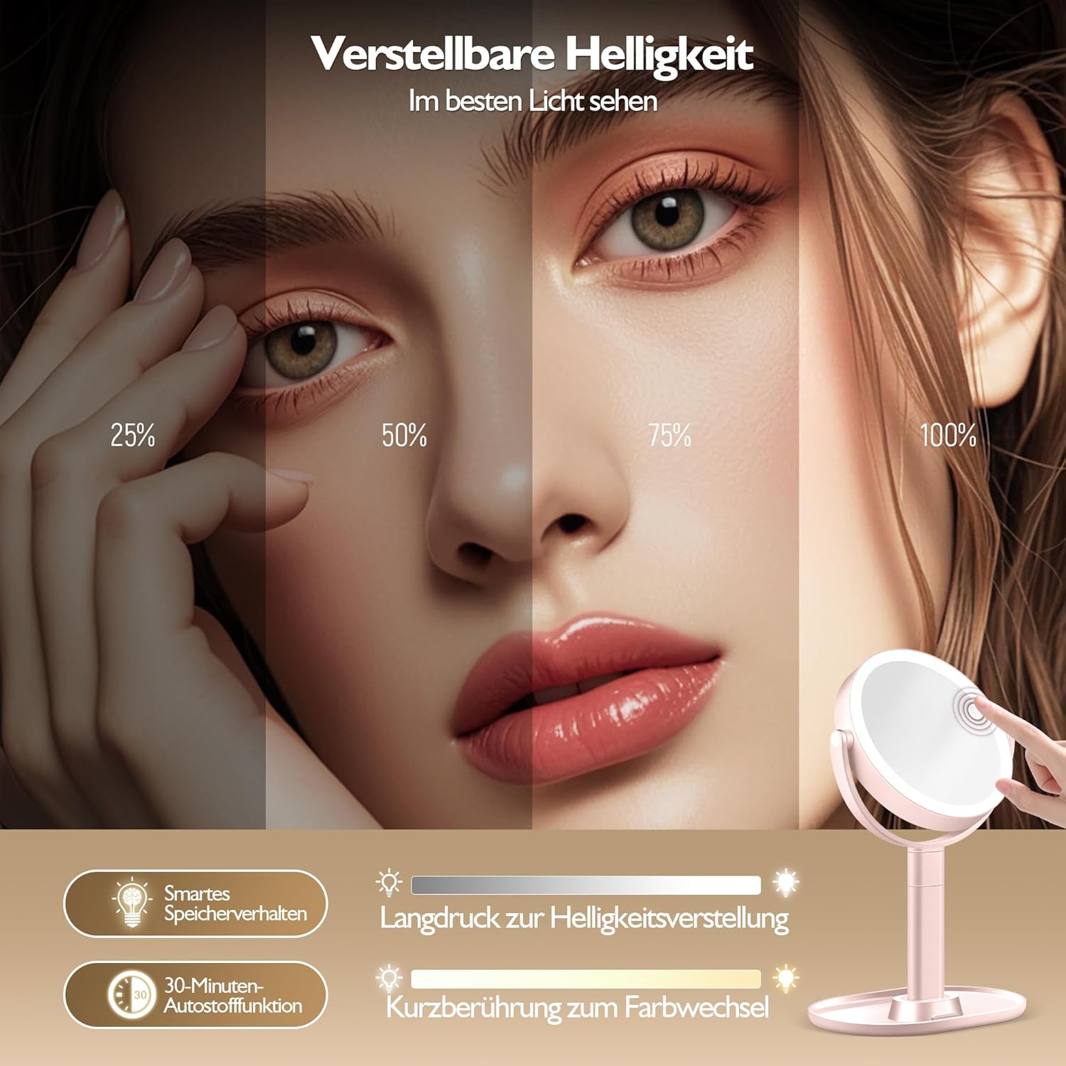 • 3-цветна светлина и безстепенно затъмняване: козметичното огледало с осветление има 64 високоинтензивни LED мъниста, които осигуряват три източника на светлина - студена, естествена и топла светлина, така че можете да превключвате между тях само с едно натискане на бутон. С безстепенното регулиране на яркостта можете лесно да създадете идеални условия на осветление за нанасяне на грим и да регулирате яркостта на козметичното огледало със светлина според всяка среда или повод.