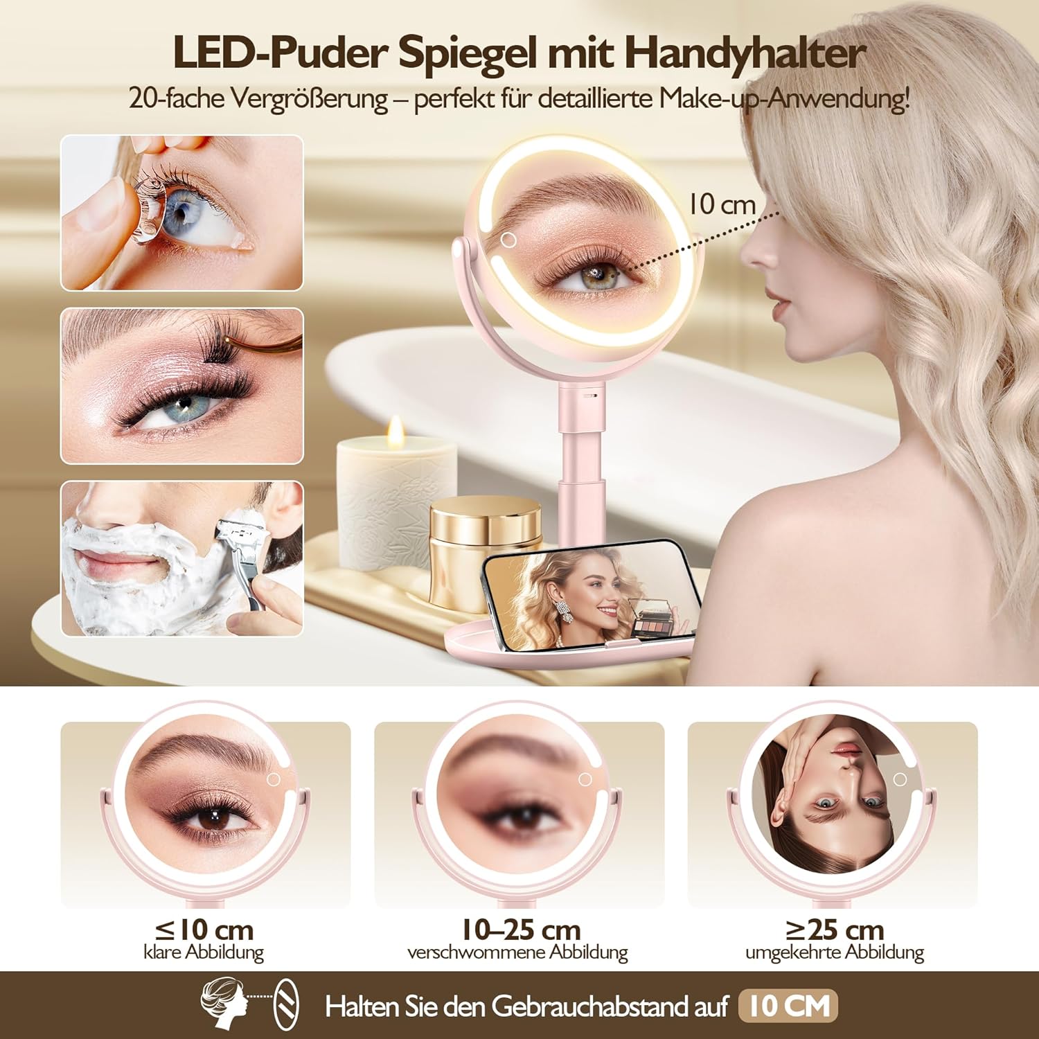 • Многофункционален дизайн и основа за съхранение: огледалото с 20-кратно увеличение и осветление на стойката не само осигурява стабилна и добре осветена платформа, но и служи като място за съхранение на вашите ежедневни козметични принадлежности. С вградения държач за смартфон можете да се наслаждавате на видео чатове без ръце, стрийминг на живо и мултимедийно съдържание, докато без усилие организирате основните си козметични принадлежности. Поддържайте пространството си без излишни предмети и лесно достъпвайте червило, молив за вежди, четки за грим, гъби за грим и други козметични продукти, всичко на едно място.