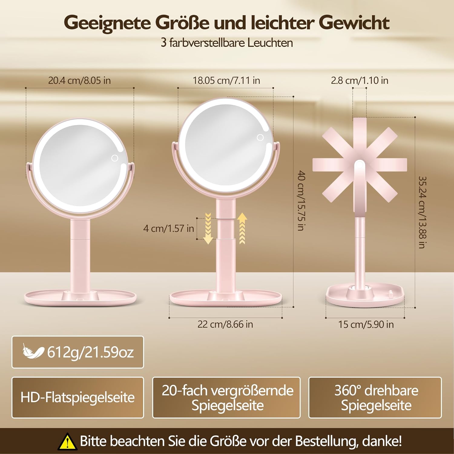 • Warm tips: To avoid dizziness when you use the table mirror with lighting 20x, simply keep your eyes 3-4 inches away from the standing mirror with lighting to ensure a comfortable experience. In addition, always use a 5V power adapter and note the maximum charging time for optimal performance.