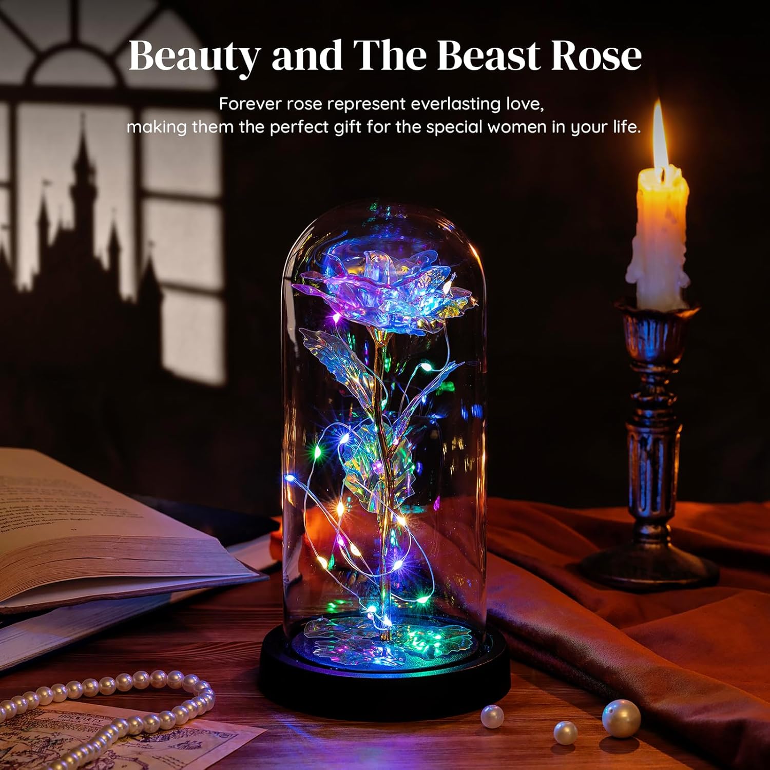 Красавицата и Звярът - Роза в стъклен купол, LED светлини - Кристална роза, цветен подарък за рожден ден, годишнина, Свети Валентин, сватба, приятелка, съпруга, жени