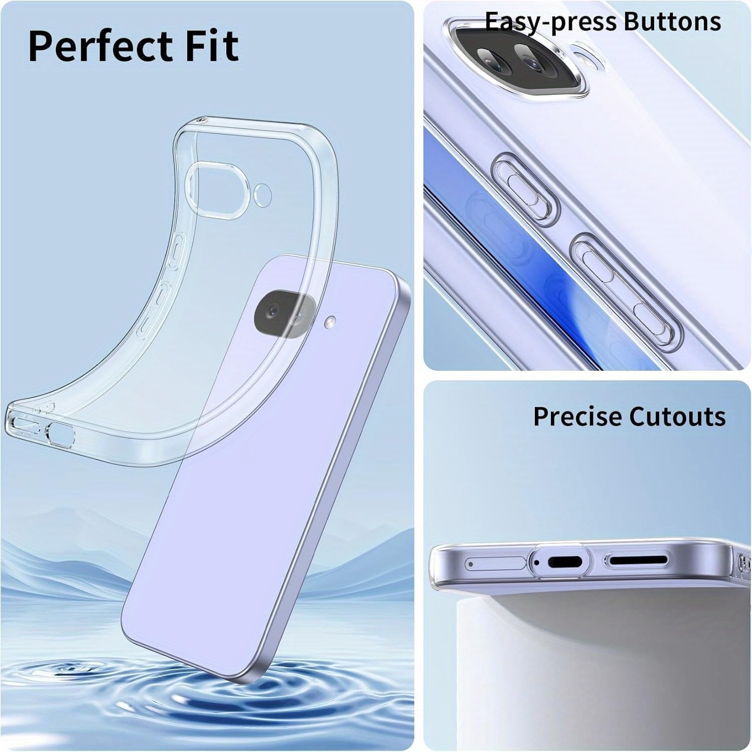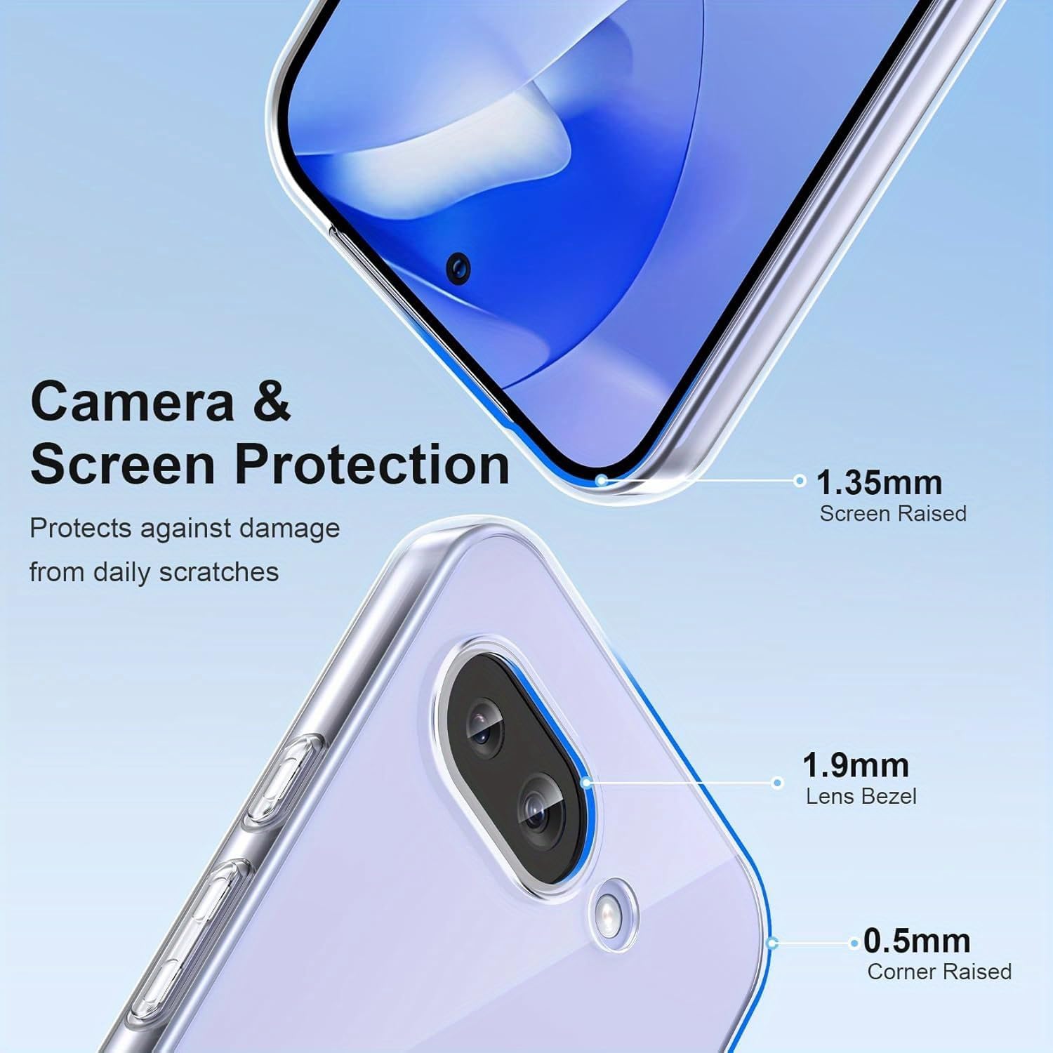 • Screen and camera protection: the case is raised by 1 mm around the camera to prevent scratches. The slightly raised edges prevent your camera and display from rubbing and scratching against flat surfaces. A combination of flexible thermoplastic polyurethane (TPU) and shock-absorbing, air-cushioned protective corners on the back of the phone case offers reliable protection against drops and other impacts.