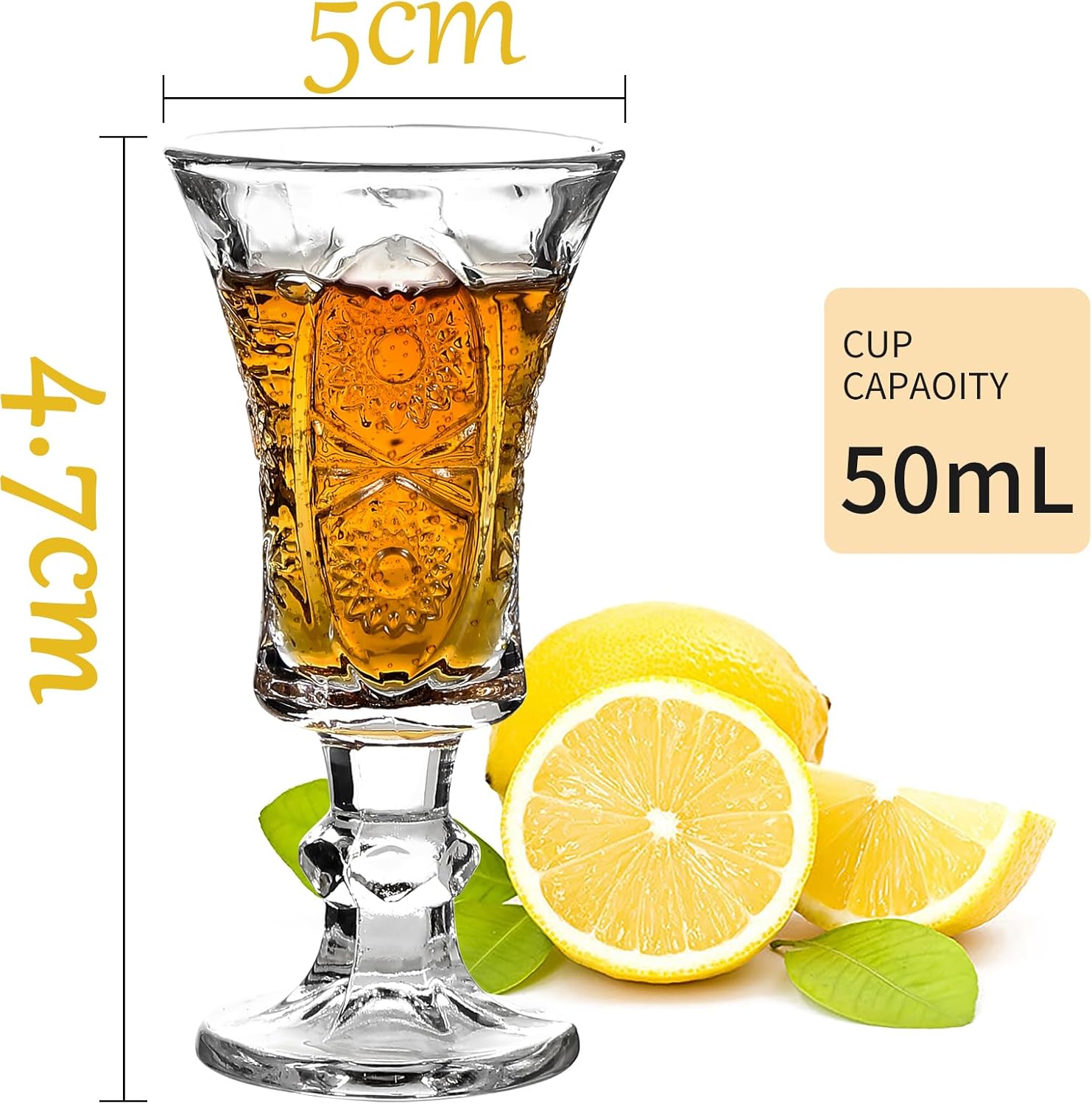 Размер: В 10 см Ш 5 см, Комплект от 6 чаши за шотове. Вместимост: 45 мл. Тези чаши за шотове са идеални за водка, текила, скоч, ликьор и шотове с ликьор. ПЕРФЕКТНИ - Кръглият капацитет от 1,3 унции (35 мл) е идеален за уиски, водка, текила, ликьор, еспресо, десерти и шотове с ликьор. Идеални за дома, бар, хотел, ресторант, курорт и нощен клуб. Този перфектен комплект чаши за шотове ще добави блясък на следващото ви семейно събиране. 100% гаранция за качество. 30-дневна гаранция за връщане на парите, ако не сте доволни.