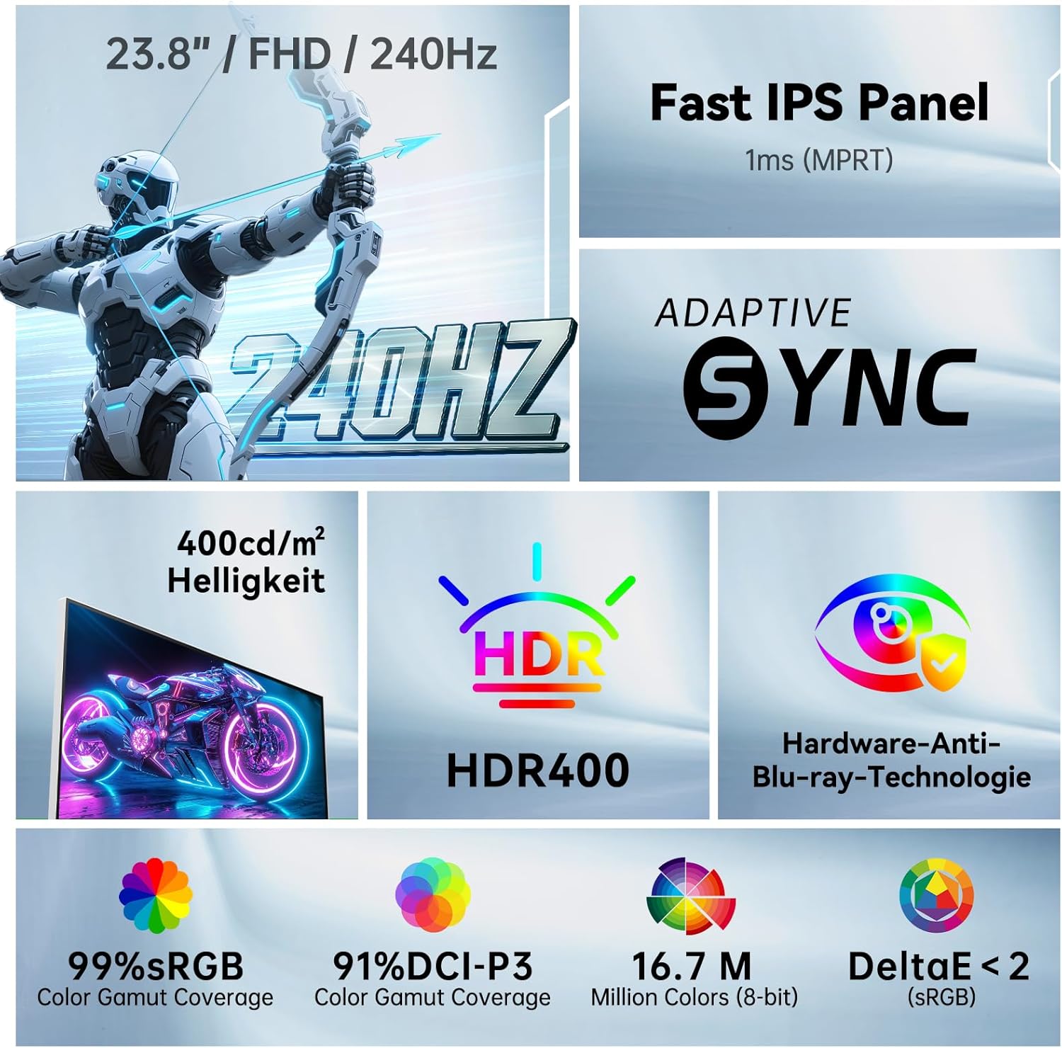 KTC Геймърски монитор 240Hz 24 инча | FHD@240Hz | Почти IPS панел | Време за реакция 1ms (MPRT) | Яркост 400 cd/㎡, HDR400 | Адаптивна синхронизация | 116% sRGB, 92% DCI-P3, ΔE<2 | Бял | H24F7