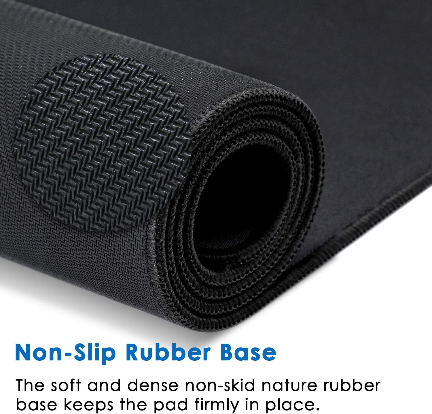 • НЕДХЛЪЗГАЩА ГУМЕНА ОСНОВА Меката и плътна неплъзгаща се естествена гумена основа държи тази подложка за бюро здраво на мястото си. Тази голяма подложка за мишка остава равномерно плоска дори върху неравни повърхности. Просто се потопете в работата или игрите си, без да се притеснявате за досадното движение на подложката за мишка.