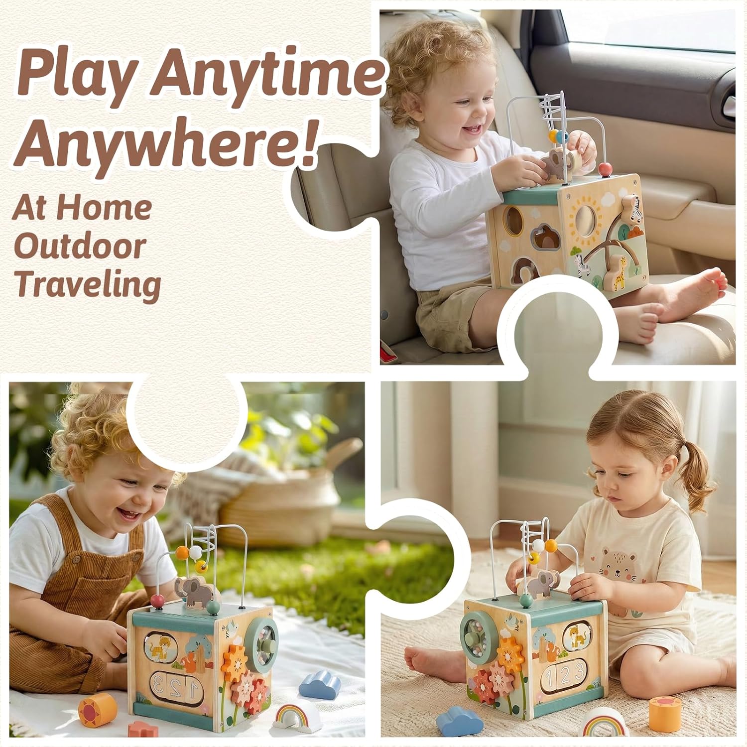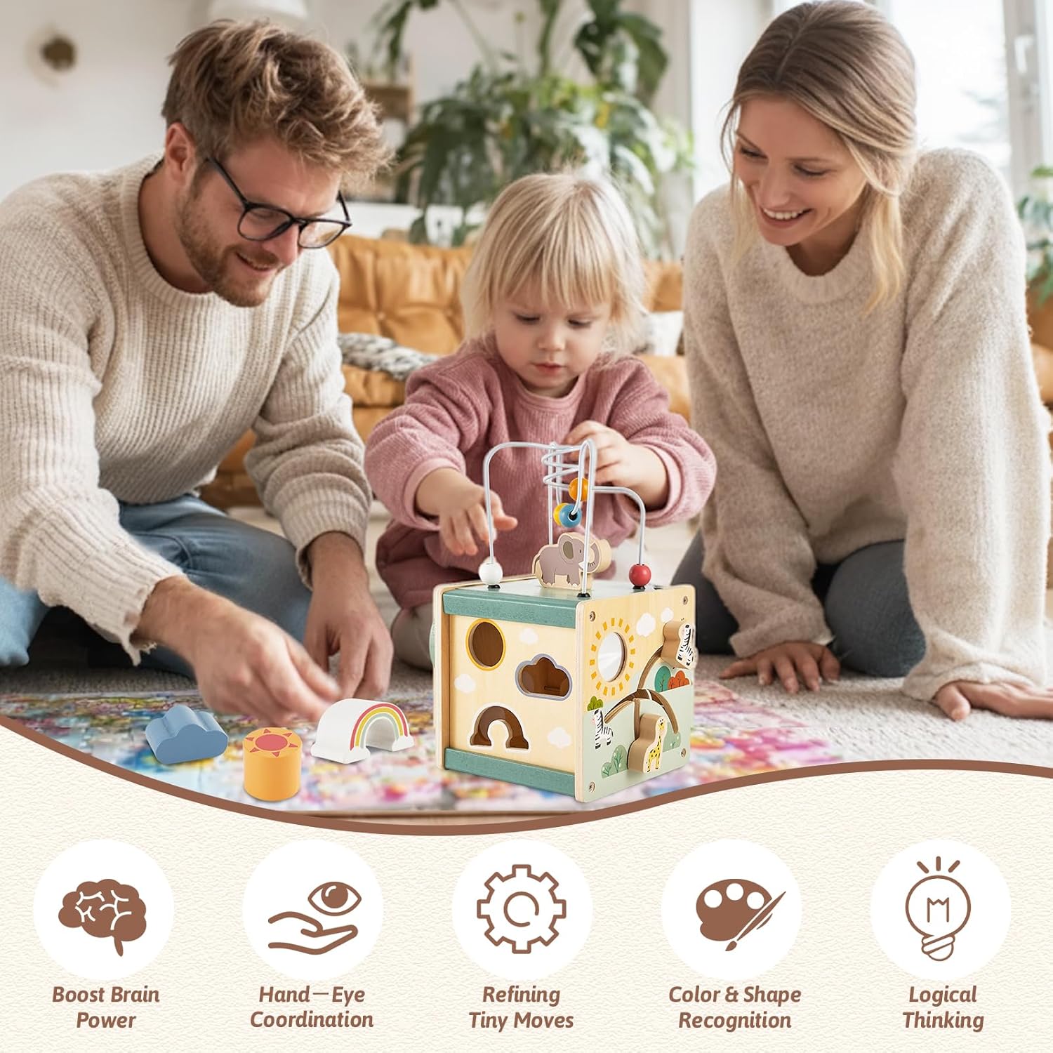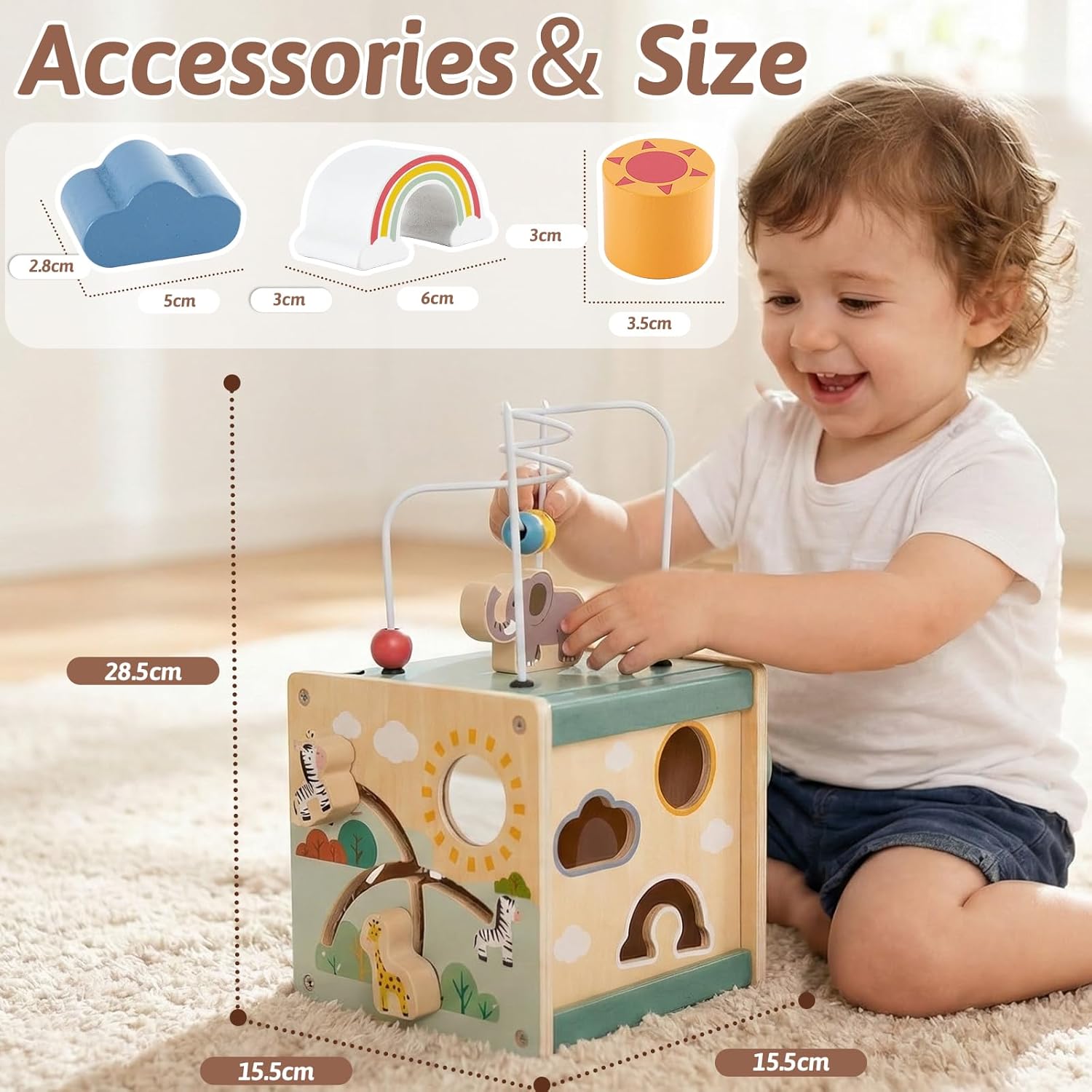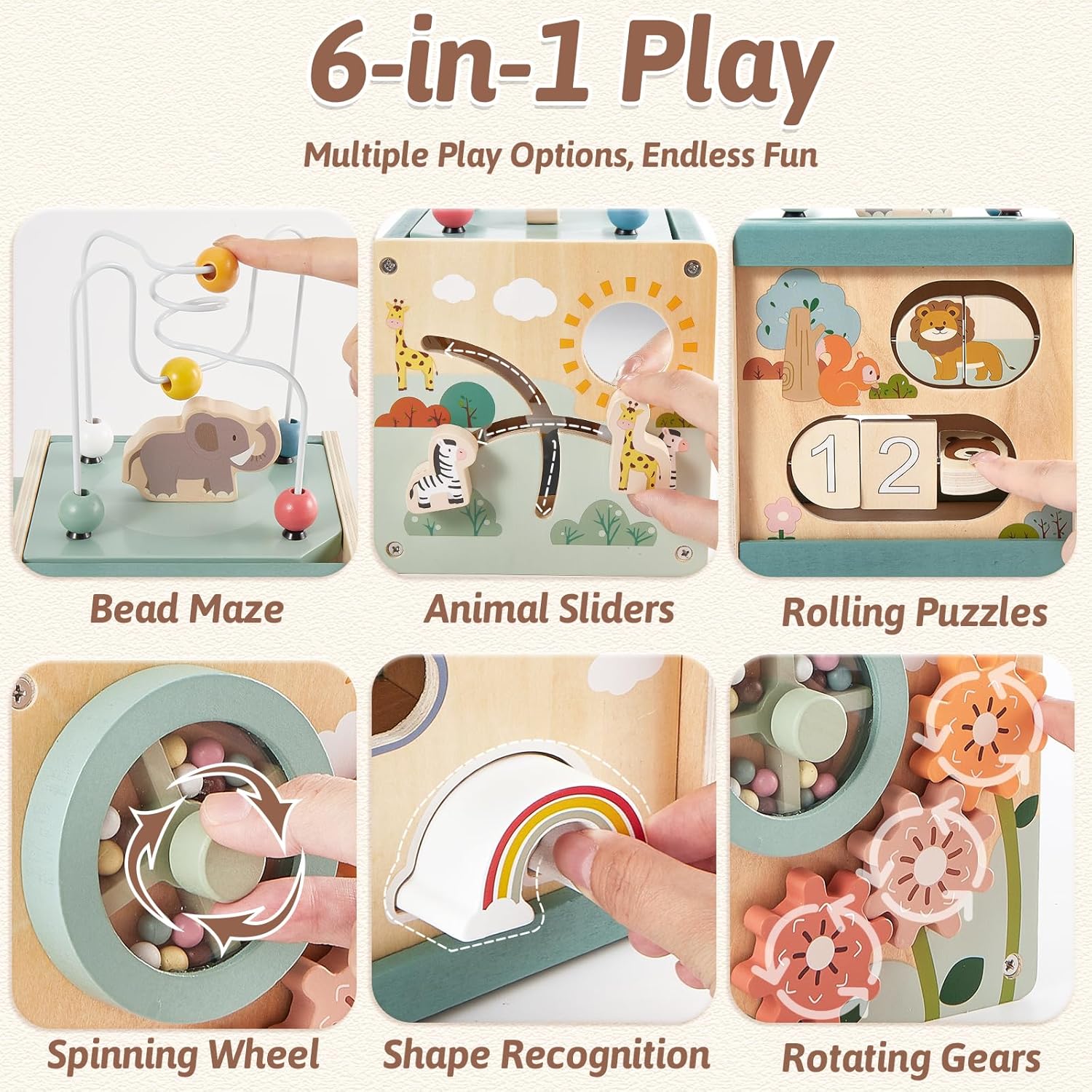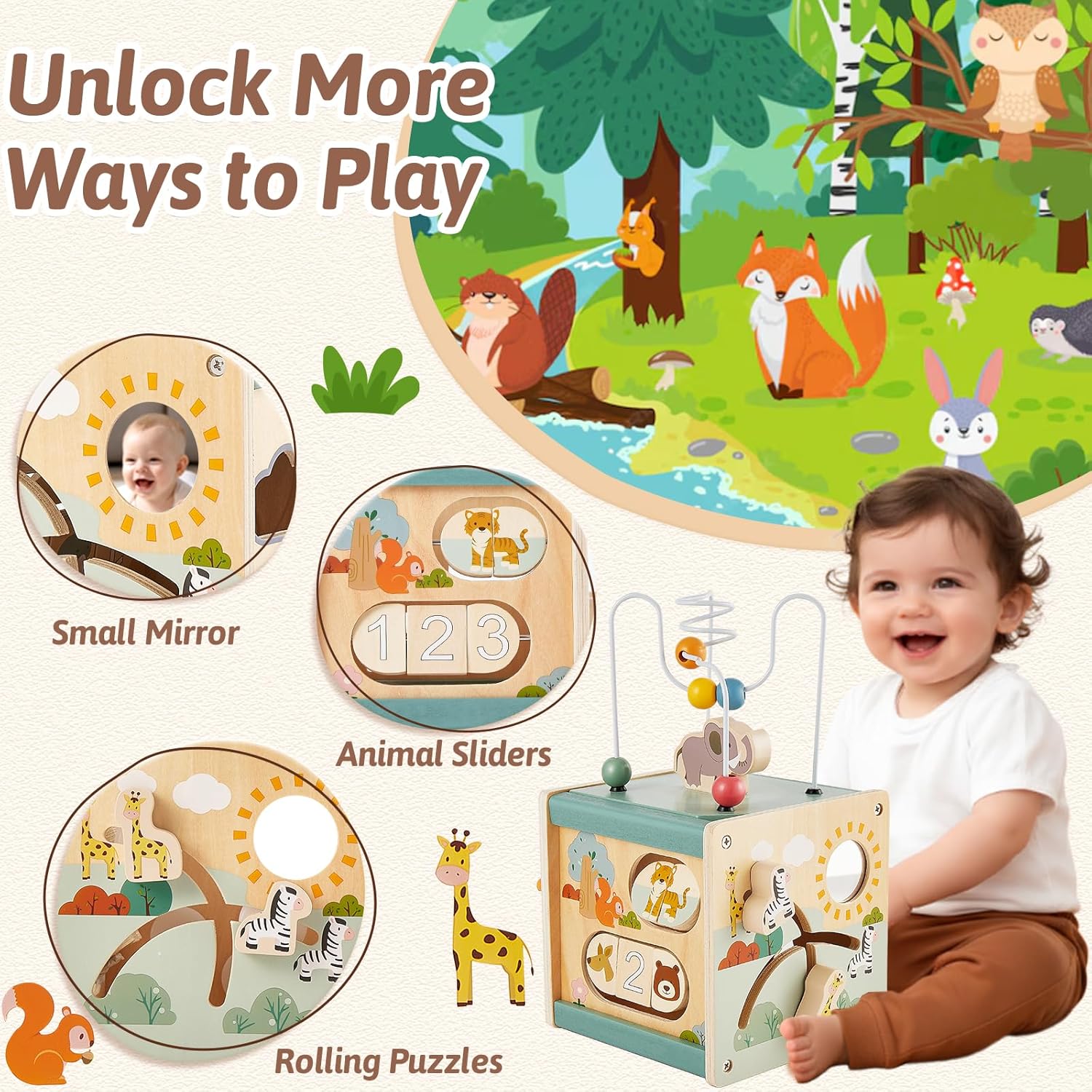 Извадете куба от опаковката му. Покажете куба на детето и обяснете различните дейности, които предлага, като лабиринти, пъзели, сортиране и въртене. Насърчете детето да изследва и да взаимодейства с характеристиките на куба, за да развие двигателните си умения и способността си да разпознава форми, животни и цветове. Наблюдавайте детето, докато играе, за да осигурите неговата безопасност.