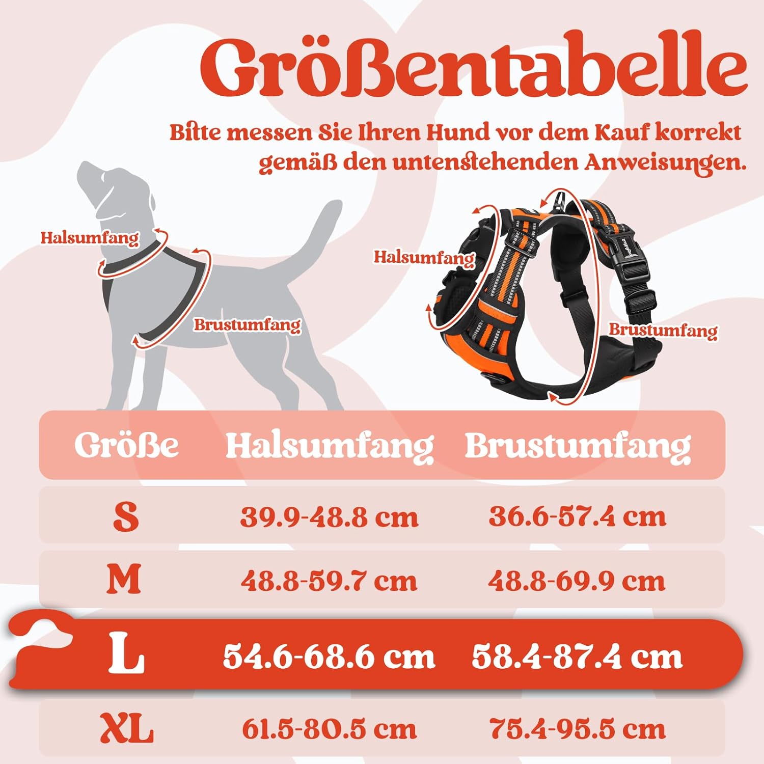 • Лесно регулиране: Четири напълно регулируеми презрамки са подходящи за повечето породи и осигуряват добро прилягане и свобода на движение, особено за кучета в бързи фази на растеж. Моля, вижте таблицата с размери, за да измерите вашия пухкав приятел и да изберете размер преди покупка. Обиколка на врата 54,6–68,6 см, обиколка на гръдния кош 58,4–87,4 см.