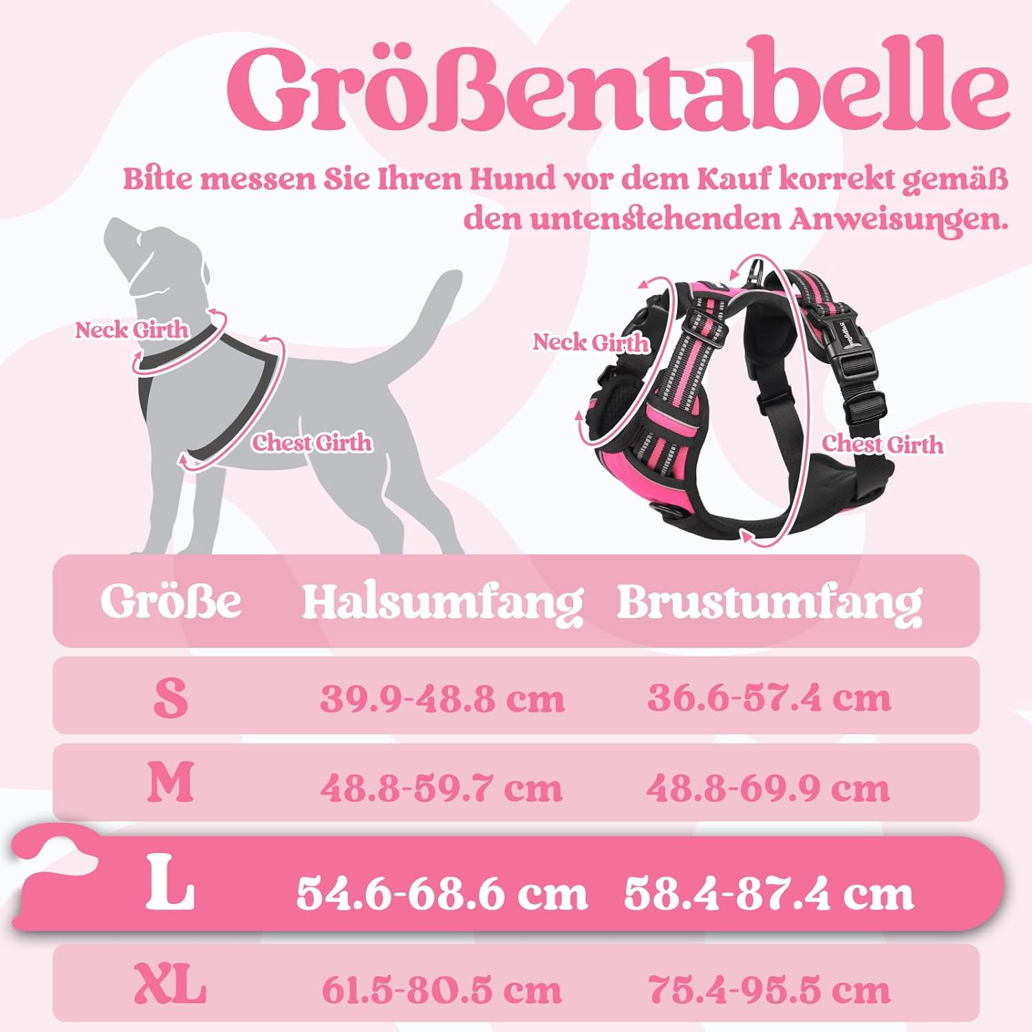 • Лесно регулиране: Четири напълно регулируеми презрамки са подходящи за повечето породи и осигуряват добро прилягане и свобода на движение, особено за кучета в бързи фази на растеж. Моля, вижте таблицата с размери, за да измерите вашия пухкав приятел и да изберете размер преди покупка. Обиколка на врата 54,6–68,6 см, обиколка на гръдния кош 58,4–87,4 см.