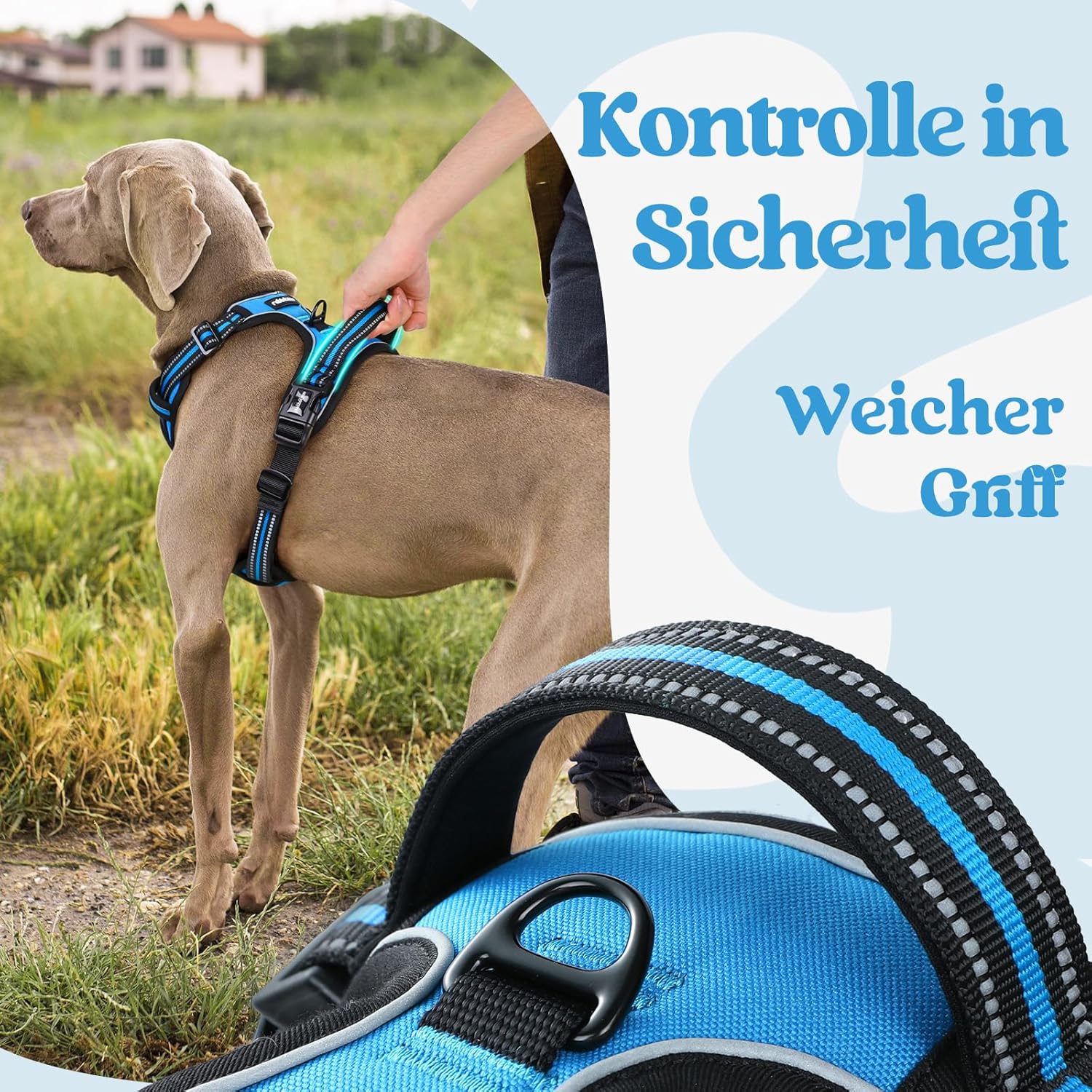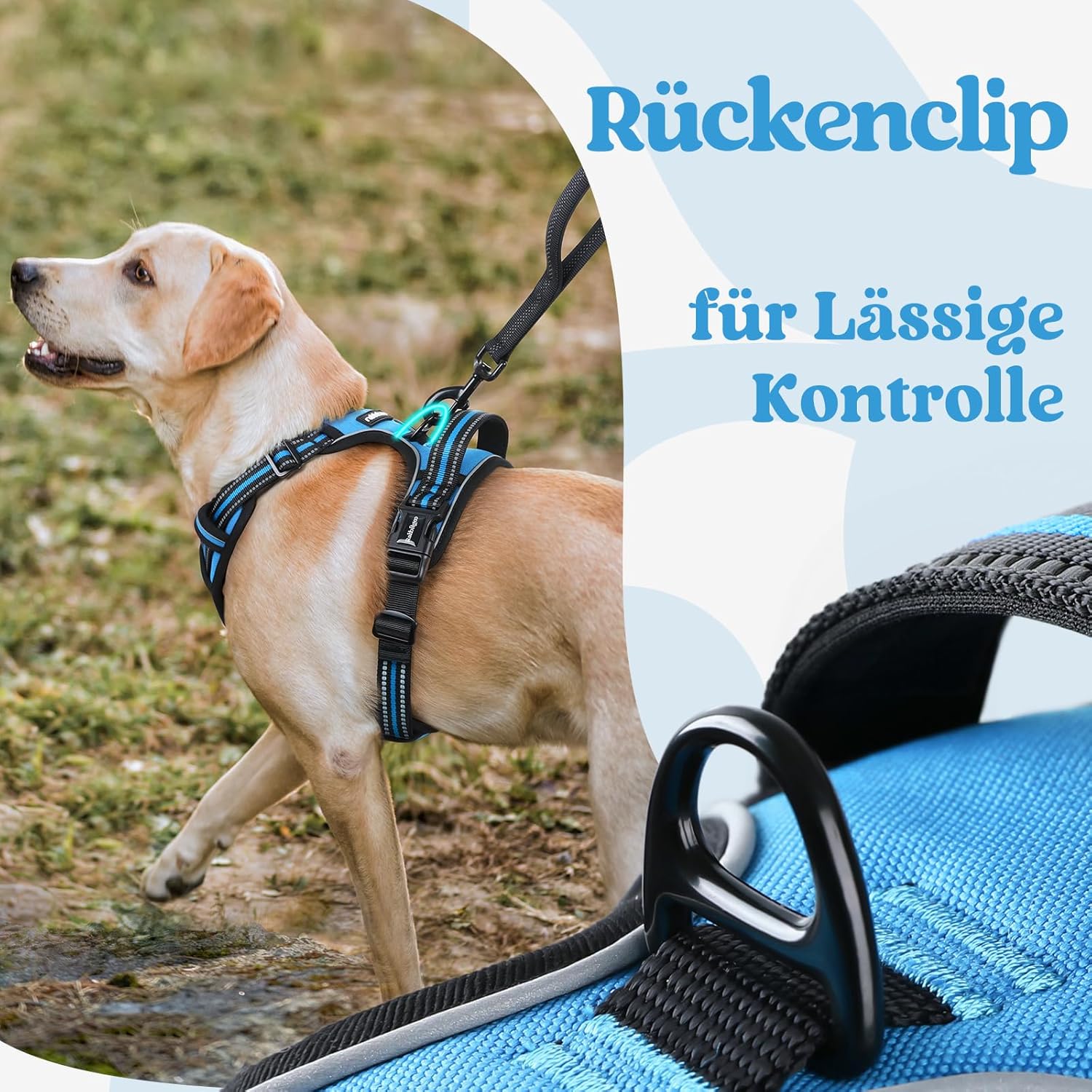 Кучешки нагръдник rabbitgoo за големи кучета, регулируем нагръдник без дърпане и задавяне, нагръдник против дърпане с дръжка, мек подплатен светлоотразителен нагръдник, светлосин, XL