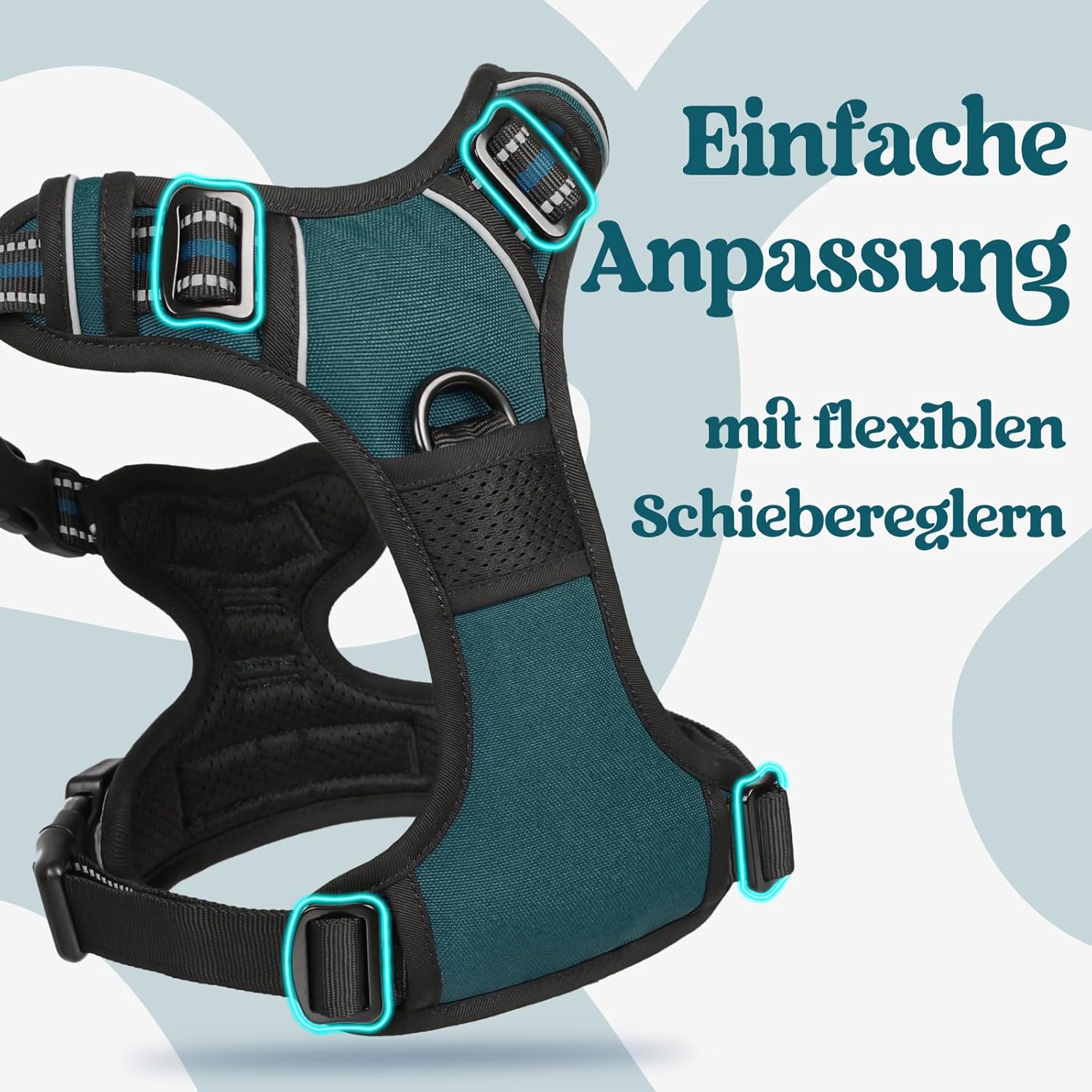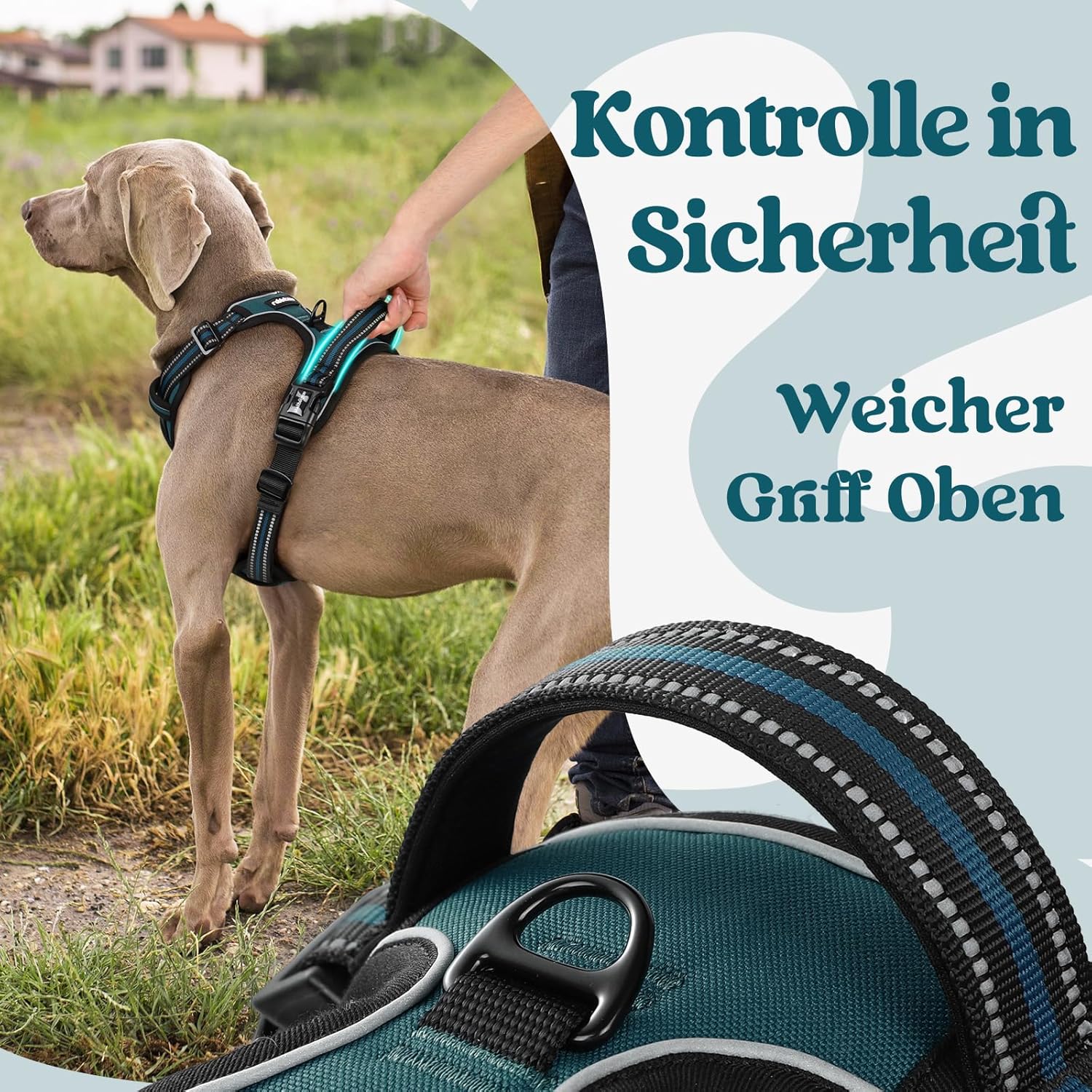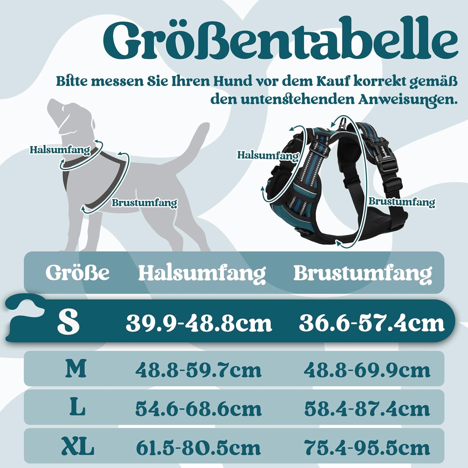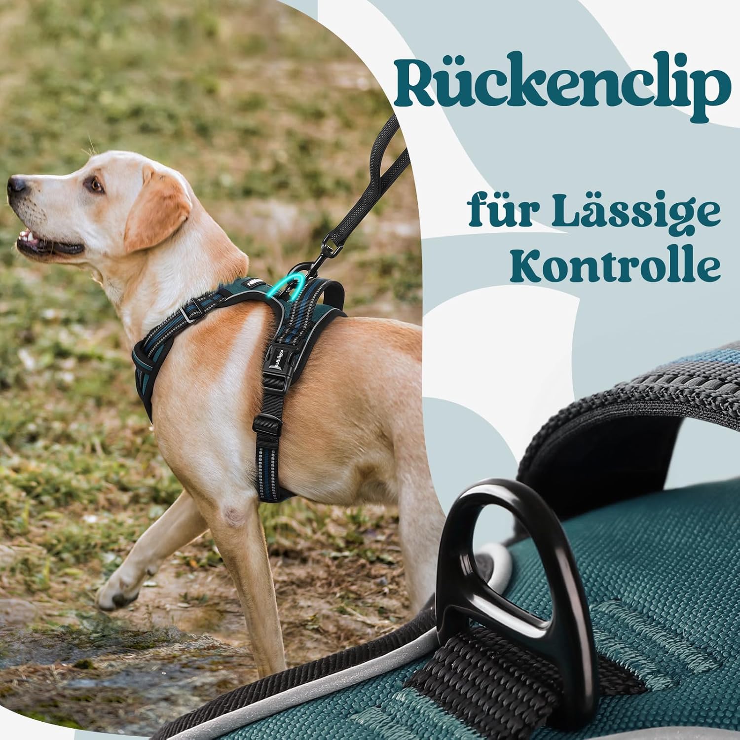 • Перфектен контрол: Нашият нагръдник за кучета против дърпане разпределя равномерно силата на дърпане и има свойства против задавяне. Нагръдникът има два цинкови пръстена на гърдите и гърба и е подходящ за ежедневни разходки, джогинг и туризъм. Ако кучето ви е ядосано или се нуждае от помощ, можете да го контролирате с дръжката отгоре.