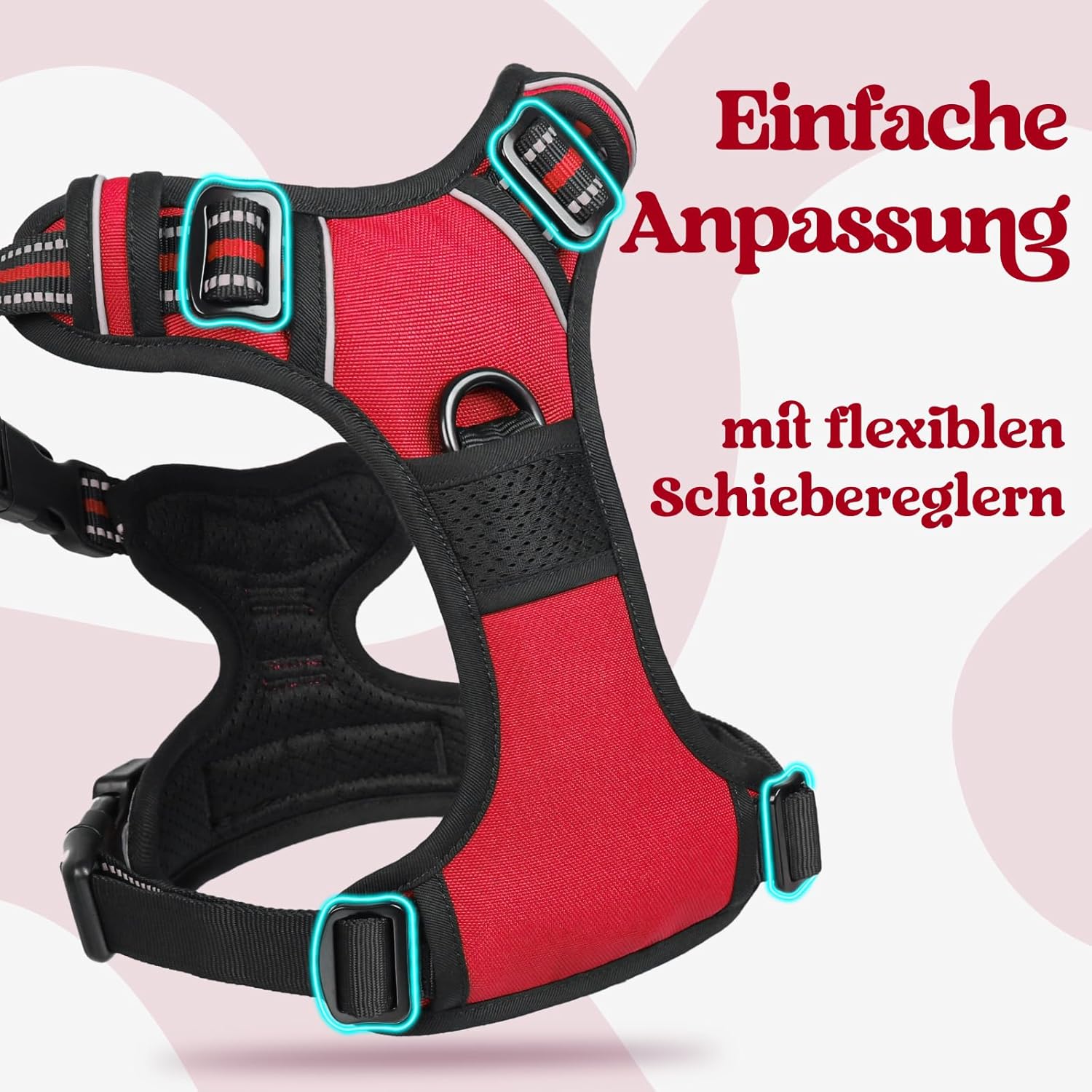 • Перфектен контрол: Нашият нагръдник за кучета против дърпане разпределя равномерно силата на дърпане и има свойства против задавяне. Нагръдникът има два цинкови пръстена на гърдите и гърба и е подходящ за ежедневни разходки, джогинг и туризъм. Ако кучето ви е ядосано или се нуждае от помощ, можете да го контролирате с дръжката отгоре.