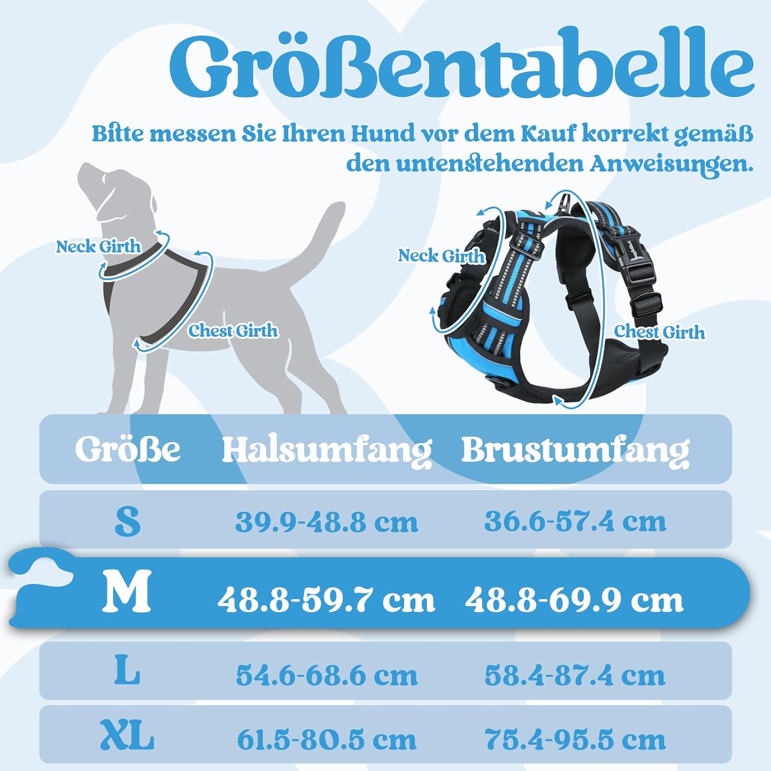 • Лесно регулиране: Четири напълно регулируеми презрамки са подходящи за повечето породи и осигуряват добро прилягане и свобода на движение, особено за кучета в бързи фази на растеж. Моля, вижте таблицата с размери, за да измерите вашия пухкав приятел и да изберете размер преди покупка. Обиколка на врата 54,6–68,6 см, обиколка на гръдния кош 58,4–87,4 см.
