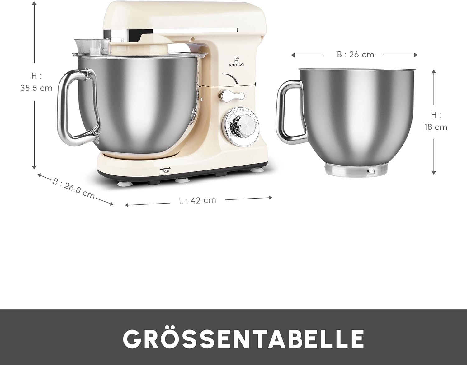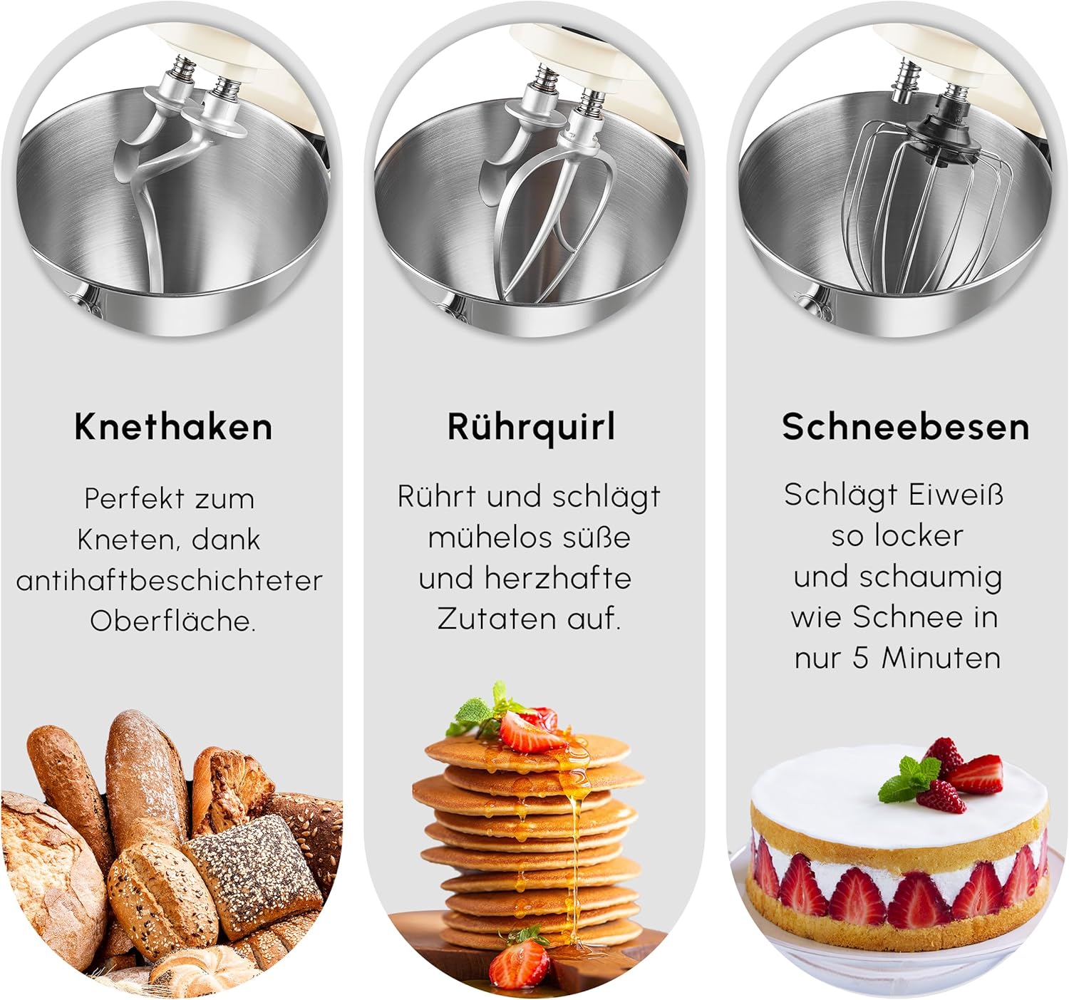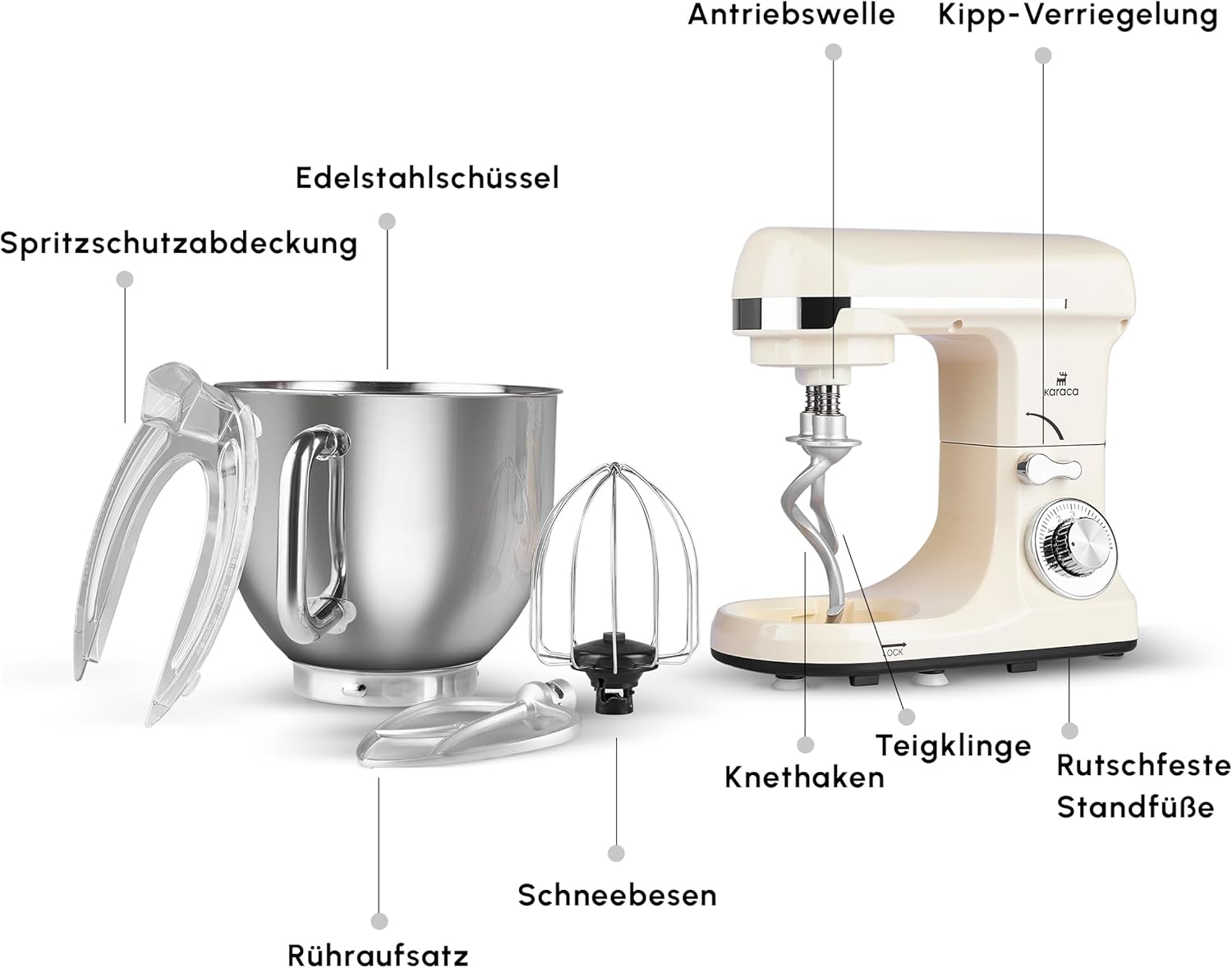• Включени са основното тяло на блендера, както и купа за смесване, крило за смесване, кука за тесто и бъркалка, всички от които помагат за приготвянето на разнообразни рецепти - от торти и сладкиши до тесто за хляб и много други.