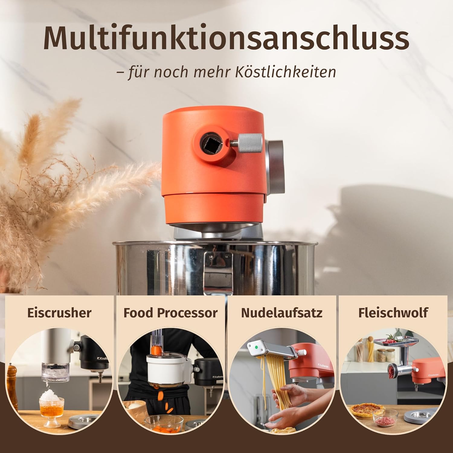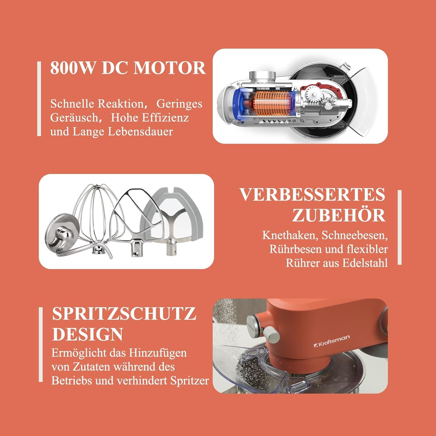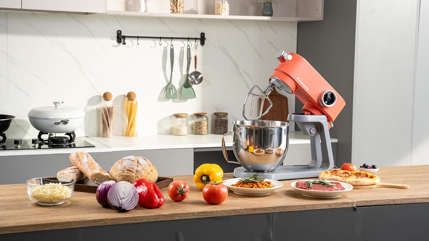 • Подобрени аксесоари: този уред за тесто има 5-литрова купа от неръждаема стомана с дръжка за една ръка, което позволява практично боравене. Включени са кука за тесто, бъркалка, плоска бъркалка и гъвкава бъркалка - всички изработени от издръжлива неръждаема стомана. Аксесоарите са подходящи за съдомиялна машина и могат да подпомогнат ефикасността при приготвянето на различни печива.